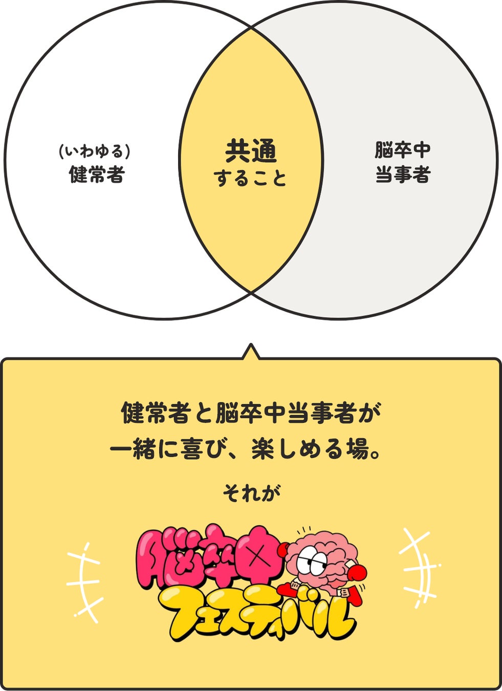 脳卒中フェスティバル(通称:脳フェス)は、脳卒中当事者、医療者、そして当事者のご家族、健常者も集まって「楽しかったね、あのイベント」と言い合えるような共通の体験を通じて、病気や障がいに対する理解や、お互いの立場への理解が深まることを願って開催されているフェスティバルです。