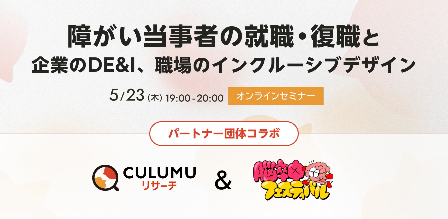 5/23(木)19:00-20:00デザインスタジオCULUMUがパートナー団体「脳フェス」と、いま企業に求められている障害者対応について、事例を交えて現在のDE&Iにおいて求められるナレッジと考え方を学べます。