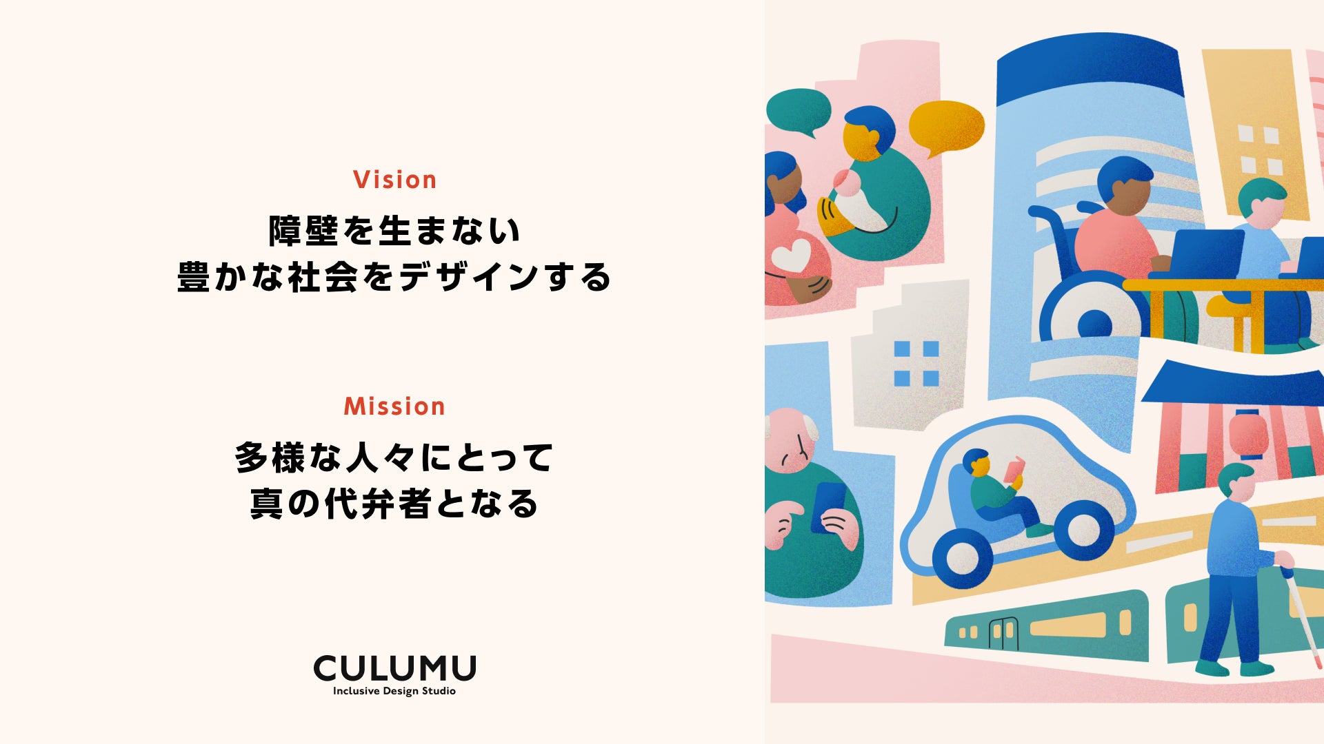 CULUMUは、"障壁を生まない豊かな社会をデザインする"をビジョンに持つ、多様な人々・社会と価値を共創するインクルーシデザインスタジオです。これまでに、社会課題起点の新規事業支援やDE&Iに取り組む事業のデザイン支援をおこなってきました。
