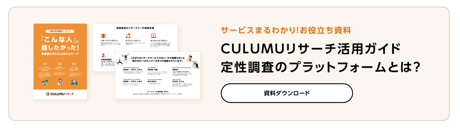 この度”多様な人々にとって真の代弁者となる”というCULUMUのミッションを体現すべく、社会的少数者(マイノリティ)・社会課題当事者の方々にアクセスし、今までスポットライトの当たることのなかった当事者のライフヒストリーや境遇・オケージョンに由来する暗黙知をより深く理解することに貢献するリサーチサービス『CULUMUリサーチ』の提供を開始しました。