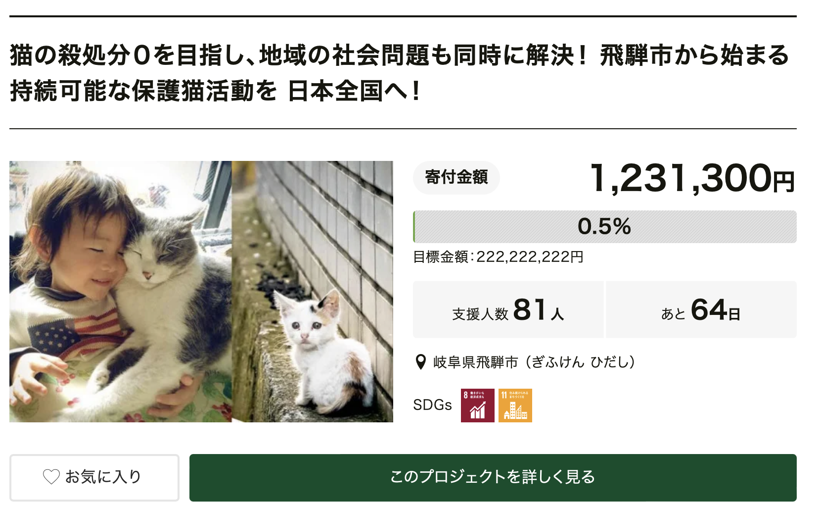 事業の資金源は、飛騨市に集まるふるさと納税で、使用目的を、「猫の殺処分ゼロを飛騨市から目指す」を選択された寄付が財源となっています。