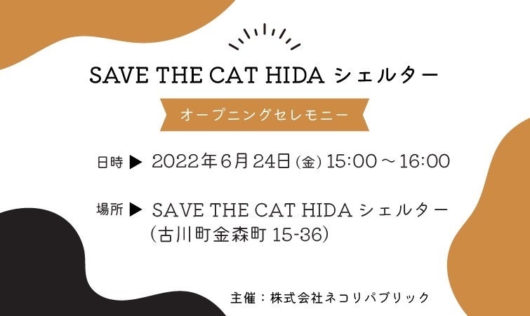株式会社ネコリパブリック(本社所在地:東京都台東区、代表取締役:河瀬麻花)は6月24日(金)15時より、岐阜県飛騨市古川町に開設した保護猫のためのオープンシェルター「SAVE THE CAT HIDA シェルター」のオープニングセレモニーを行います。