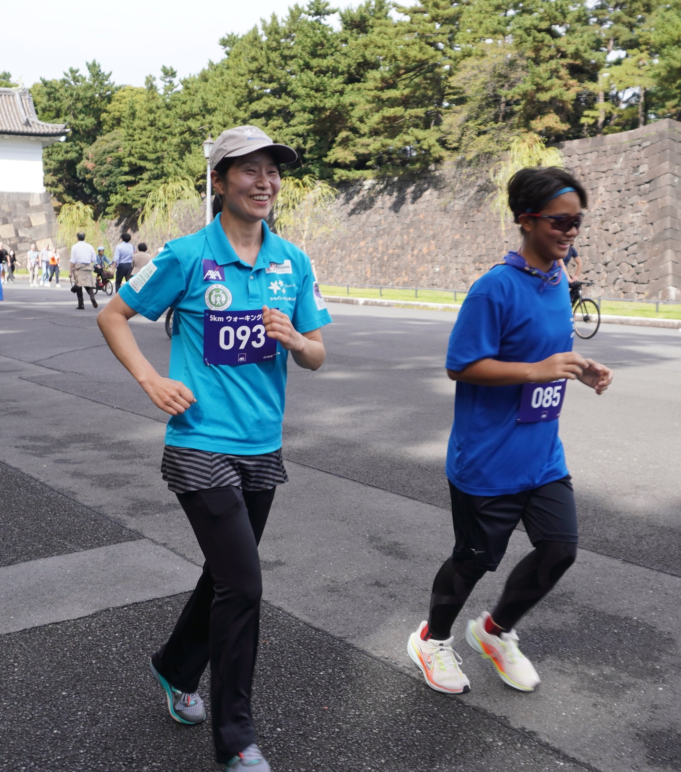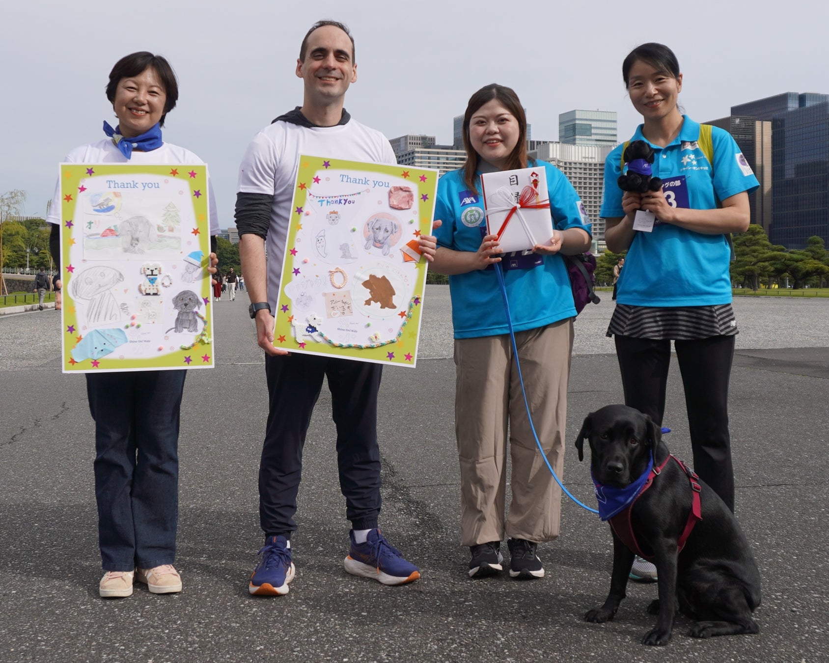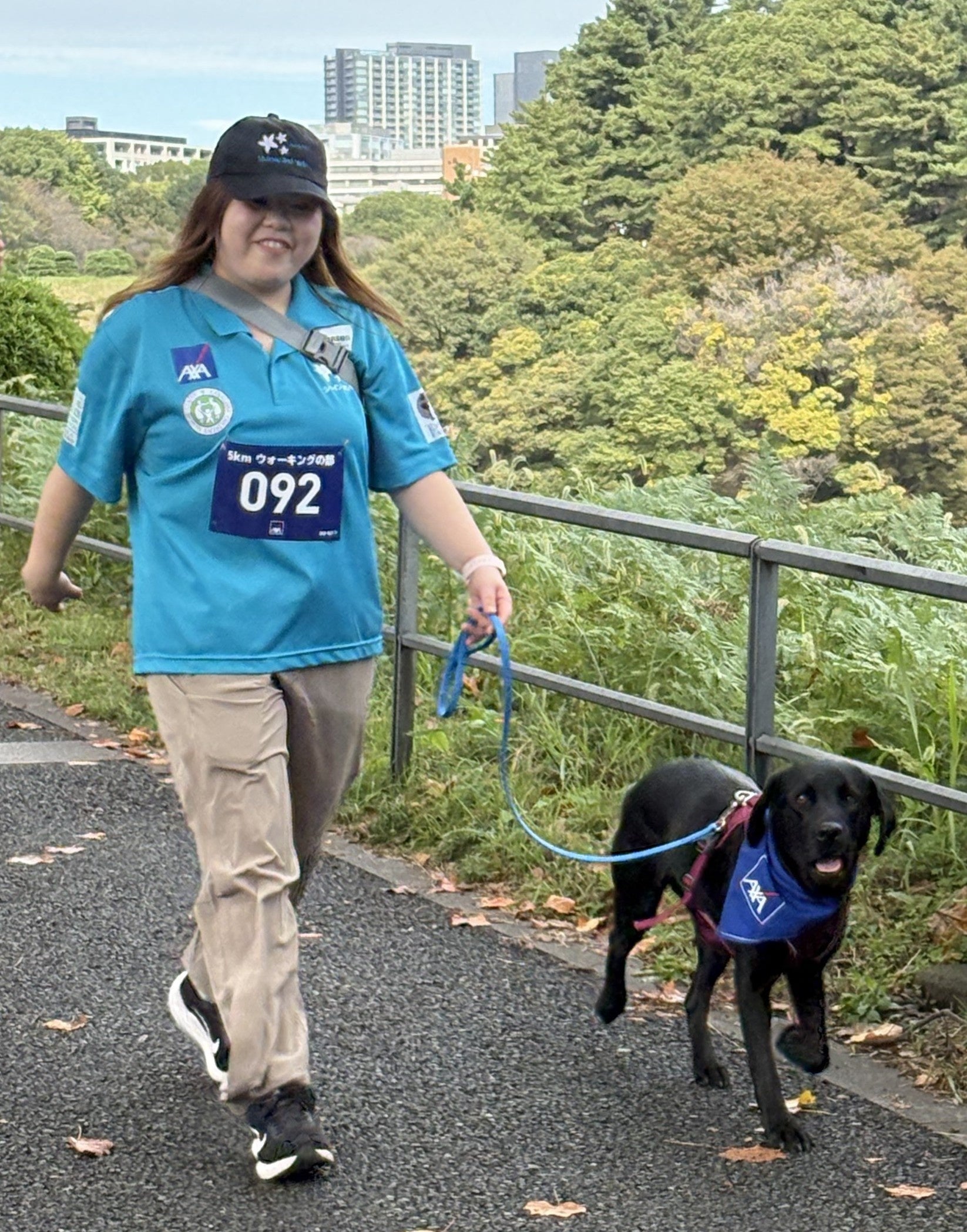 また、当日は闘病を経験したシャイン・オン!メンバーの子どもたちとそのご家族もご招待いただきました。当初は5kmウォークに参加予定だったハンドラー・リーダーの森田でしたが、参加されていたシャイン・オン!メンバーのお子さんに引っ張ってもらい10kmという未知の距離を完走しました。かつて、アニーのハンドラーとして自分が支えていたお子さんから、今度は自らが支えられたことに胸を打たれ、特別な節目となりました。