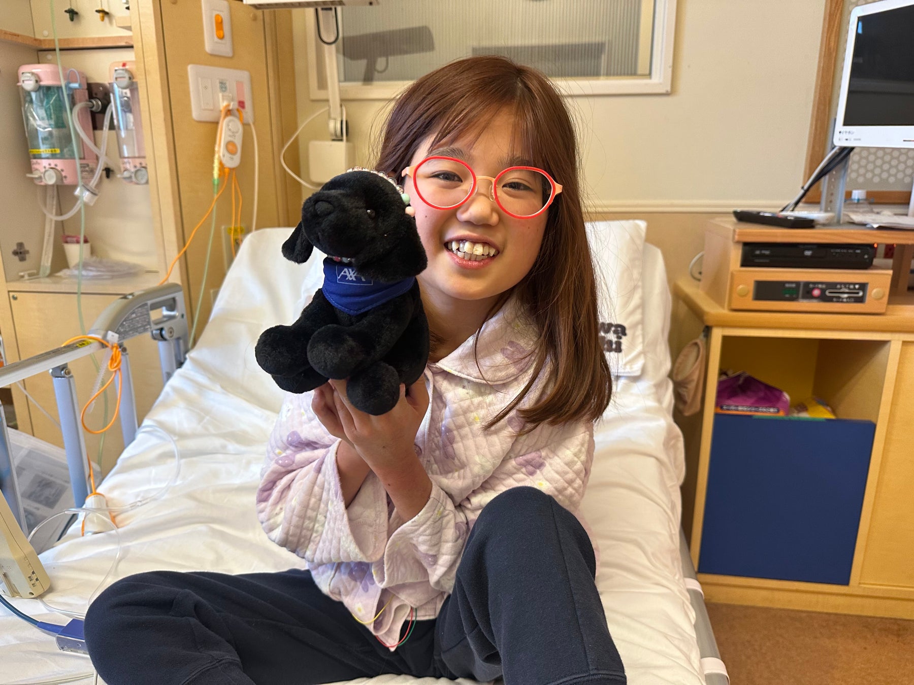 チャリティラン当日にお預かりしたオリのぬいぐるみは、後日、森田と市川が病棟を訪れ、入院中の子どもたちへお渡しいたしました。昨年までのアニーのぬいぐるみとは異なり、オリの黒いぬいぐるみにはアクサジャパンのオリジナルバンダナが巻かれており、アニーからオリへつながった歩みを物語るものでもありました。