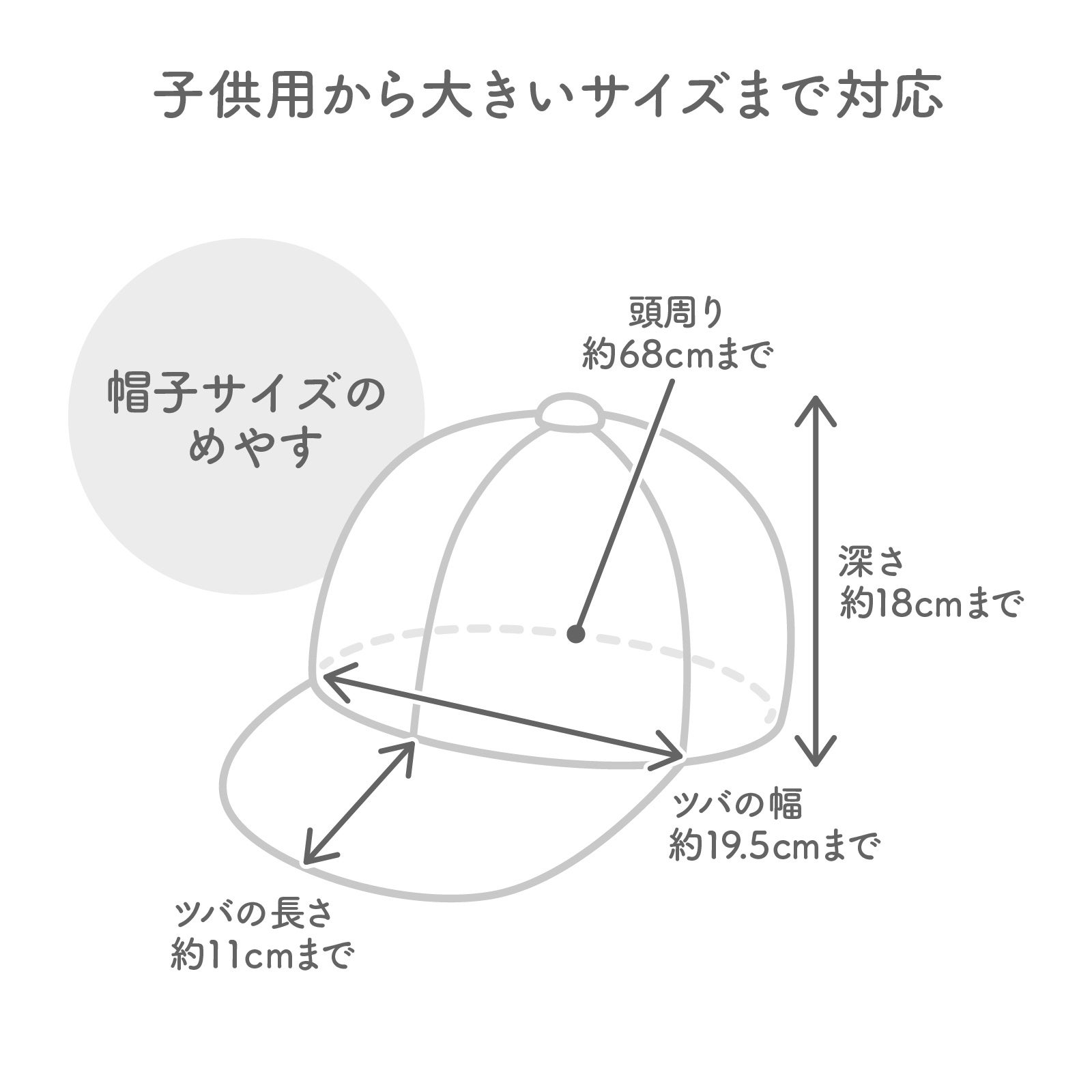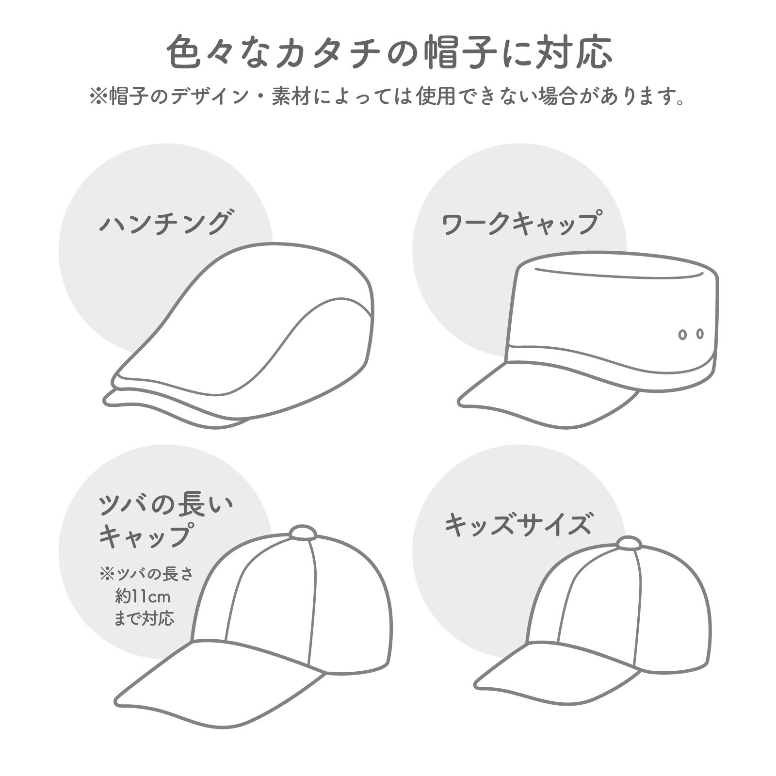 フラットキャップやワークキャップ、ハンチング、子供用から大きいサイズ、ツバが長いキャップなど、幅広い形の帽子に対応できます。