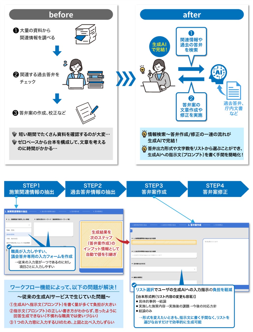 ✔ 情報検索から答弁案作成/修正までの各ステップの作業を生成AI-ワークフロー機能で完結