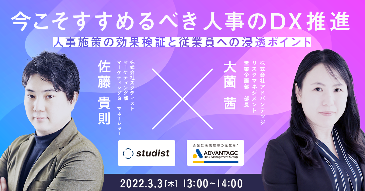 株式会社アドバンテッジリスクマネジメント( https://www.armg.jp/) は、3月3日(木)、経営者、人事労務/経営企画/組織・人材開発部門のご担当者・責任者の方々を対象に、「人事領域におけるDX」をテーマとしたWebセミナーを開催いたします。本セミナーは、マニュアル作成・共有システム「Teachme Biz」を提供する株式会社スタディスト(https://studist.jp/)との共催となります。