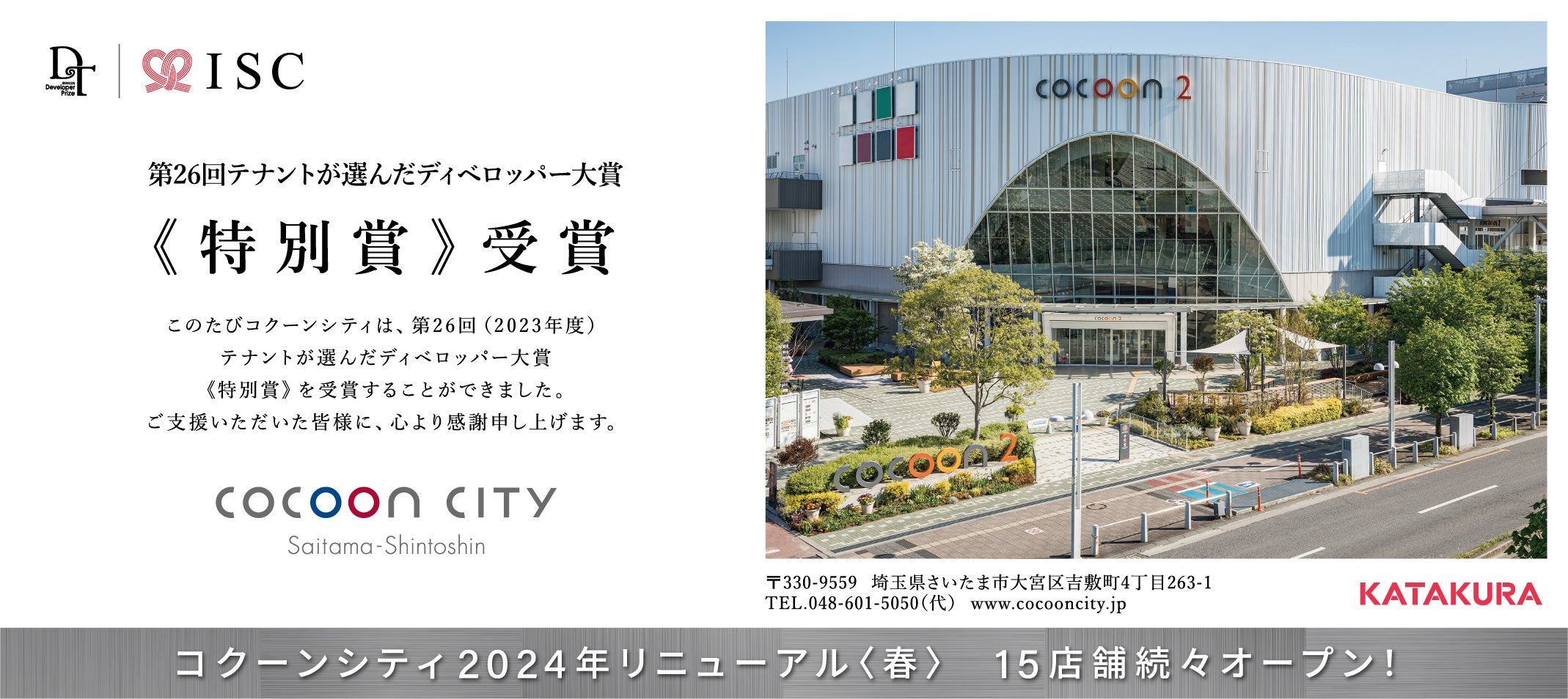 カタクラが運営するJRさいたま新都心駅前社有地商業エリア「コクーンシティ」におきまして、繊研新聞社主催「第26回(2023年度)テナントが選んだディベロッパー大賞」の「特別賞」を受賞しましたので、お知らせします。今後も、お客様にもテナント様にも“選ばれ続ける街づくり”に努めて参ります。