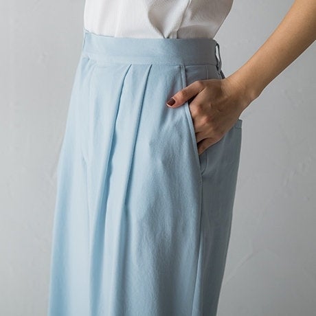 ✓直線気味のウエストベルトで脚長見せ、後ゴムは脇から離して膨らみを軽減。