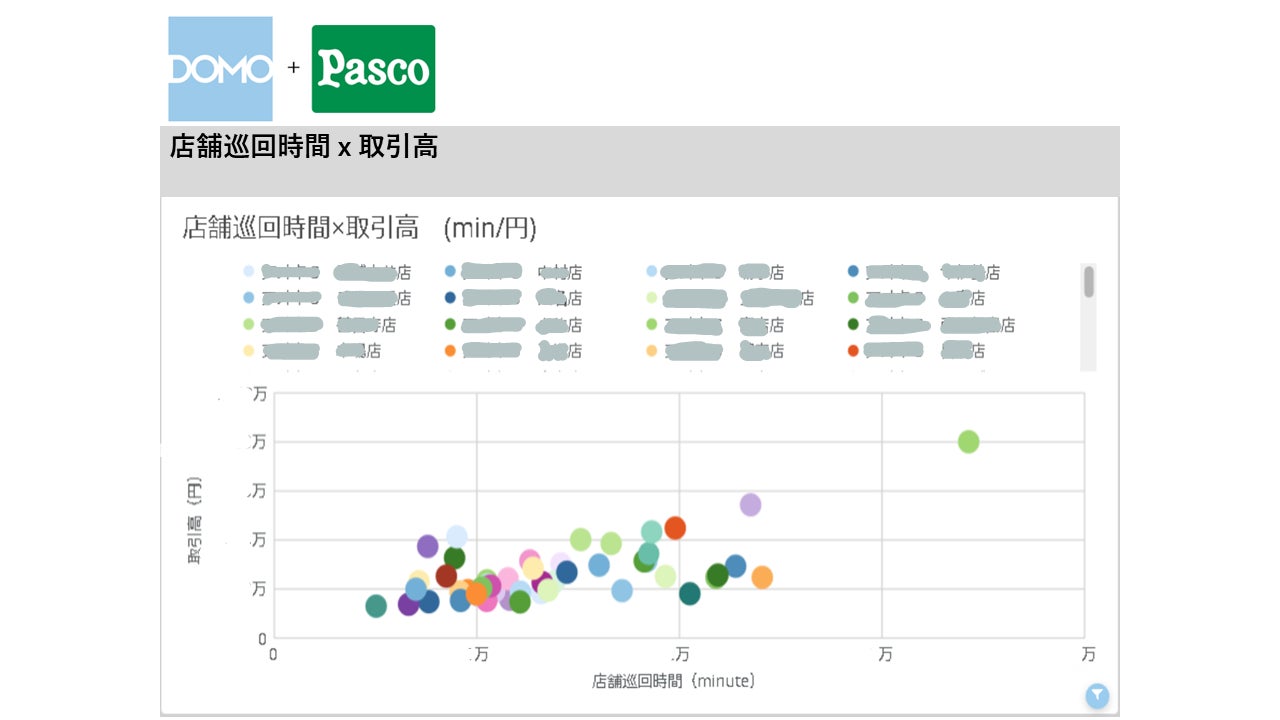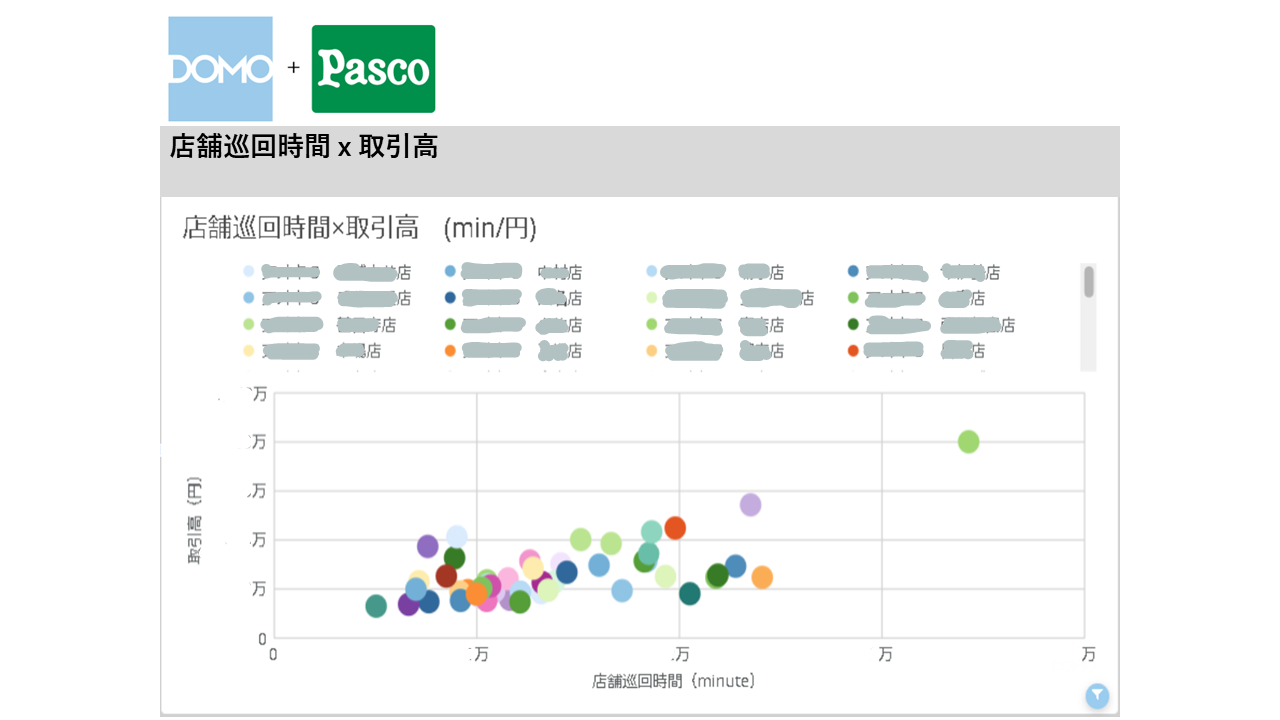 営業DX推進部は、手作業で行っていたレポート配信作業をDomoで自動化するなど、営業の「困りごと」を丁寧に聞き取り、ルーティンワークを次々とDomoに置き換えていきました。具体的には、営業活動内容を「商談・受発注・事務作業」などの項目に分類し、その割合と売上高や取引高と掛け合わせて時系列で一目で見てわかるように表示しています。また、各店舗の巡回時間と取引高の相関関係をバブルチャートで可視化しています。