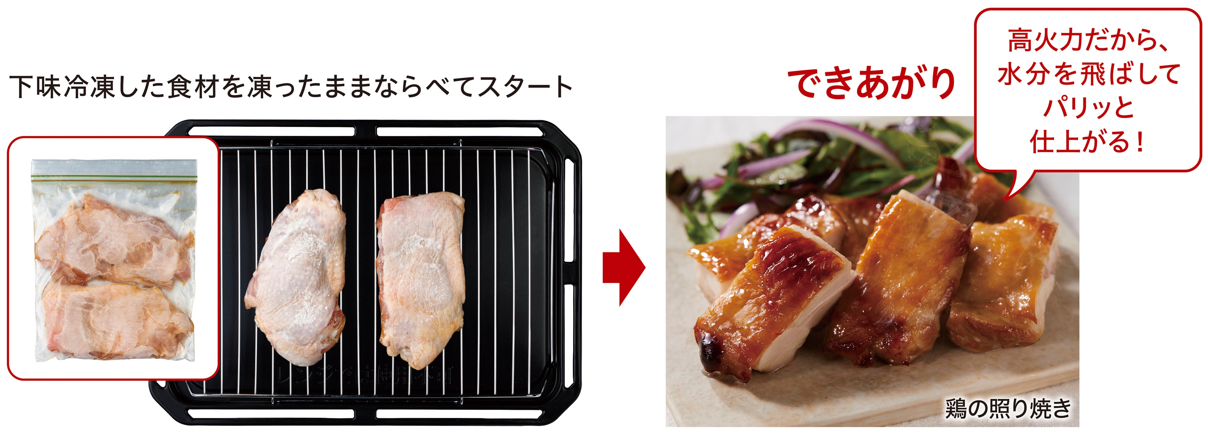 1. 下味冷凍した肉や魚を凍ったまま並べるだけで、おいしく焼き上げる「冷凍から焼き物」調理
