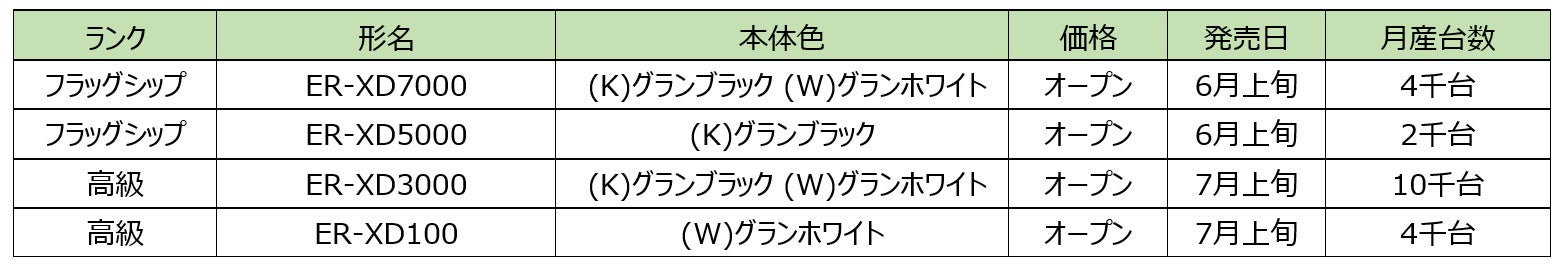 左から、ER-XD7000(K)グランブラック、(W)グランホワイト/ER-XD5000(K)グランブラック/ER-XD3000(K)グランブラック、(W)グランホワイト