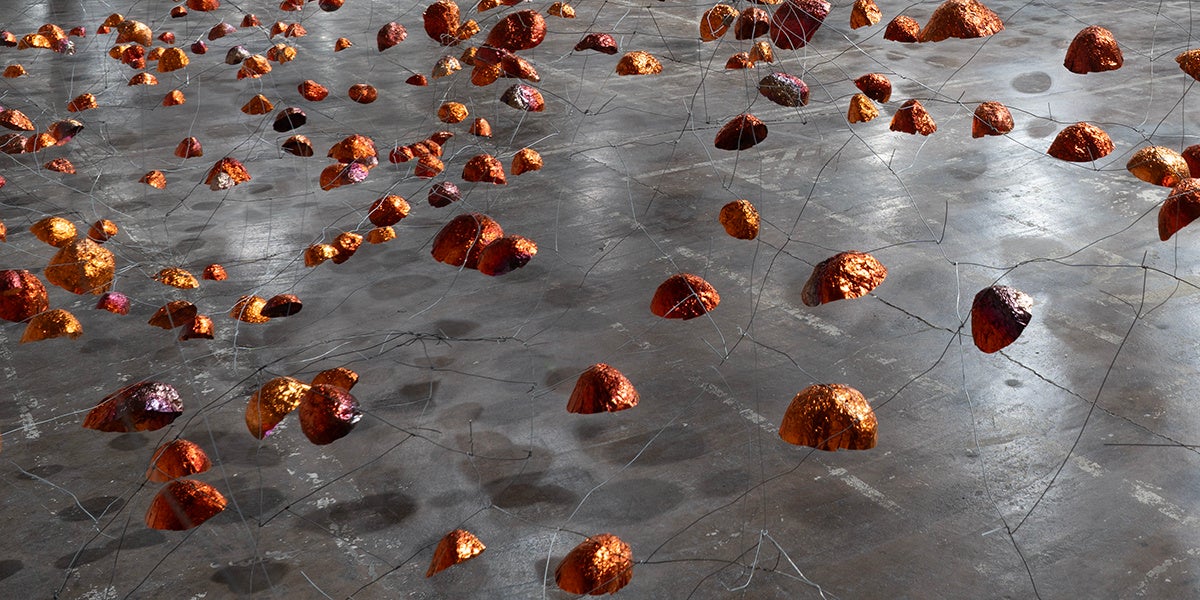 本展では、大西が近年取り組んでいる銅箔を素材とした作品の新作を展示します。銅箔は、多くの電子機器の内部で重要な役割を果たしていますが、人の目に触れることはなく、多くの人はほとんどその存在を意識することもありません。大西は、私たちの日常を裏側から支える銅箔をその機能から離し、河原の石に被せて叩くことによって成型し、大型のインスタレーションへと組み上げていきます。