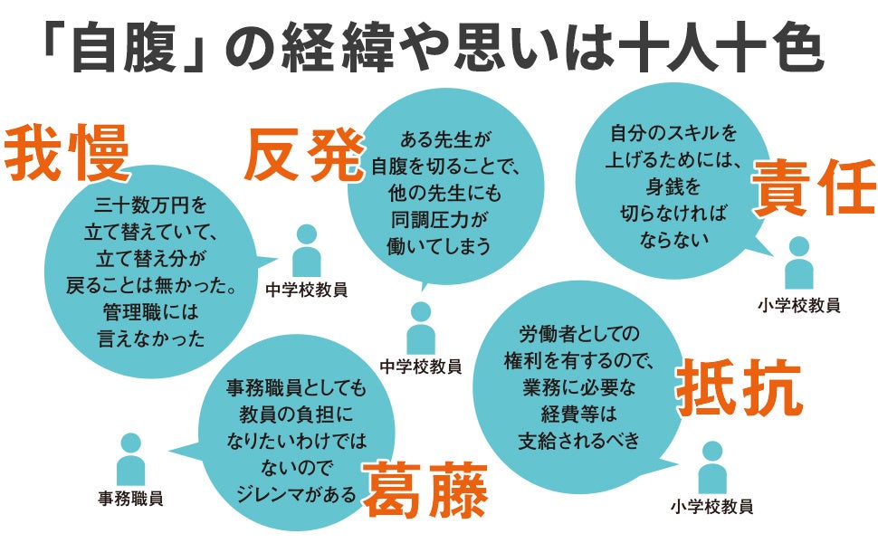 教職員が仕事をするうえで、必要なものを私費で負担する「自腹」は、人や学校により差はあるものの、金額の大小や費目・場面を問わず、これまで大いに存在してきました。