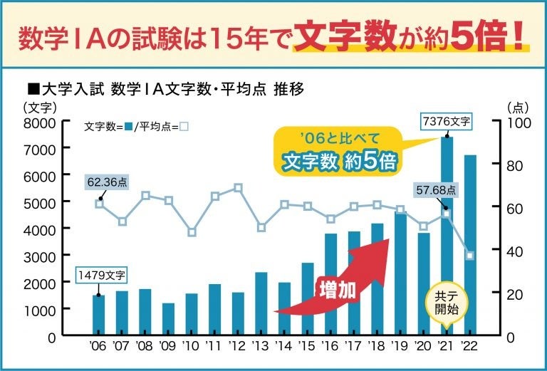 国語は、例年文字数が多いことはもちろんですが、特筆すべき点としては、数学IAの文字数が15年で約5倍に増えています。(数学の分析の記事はこちらから)