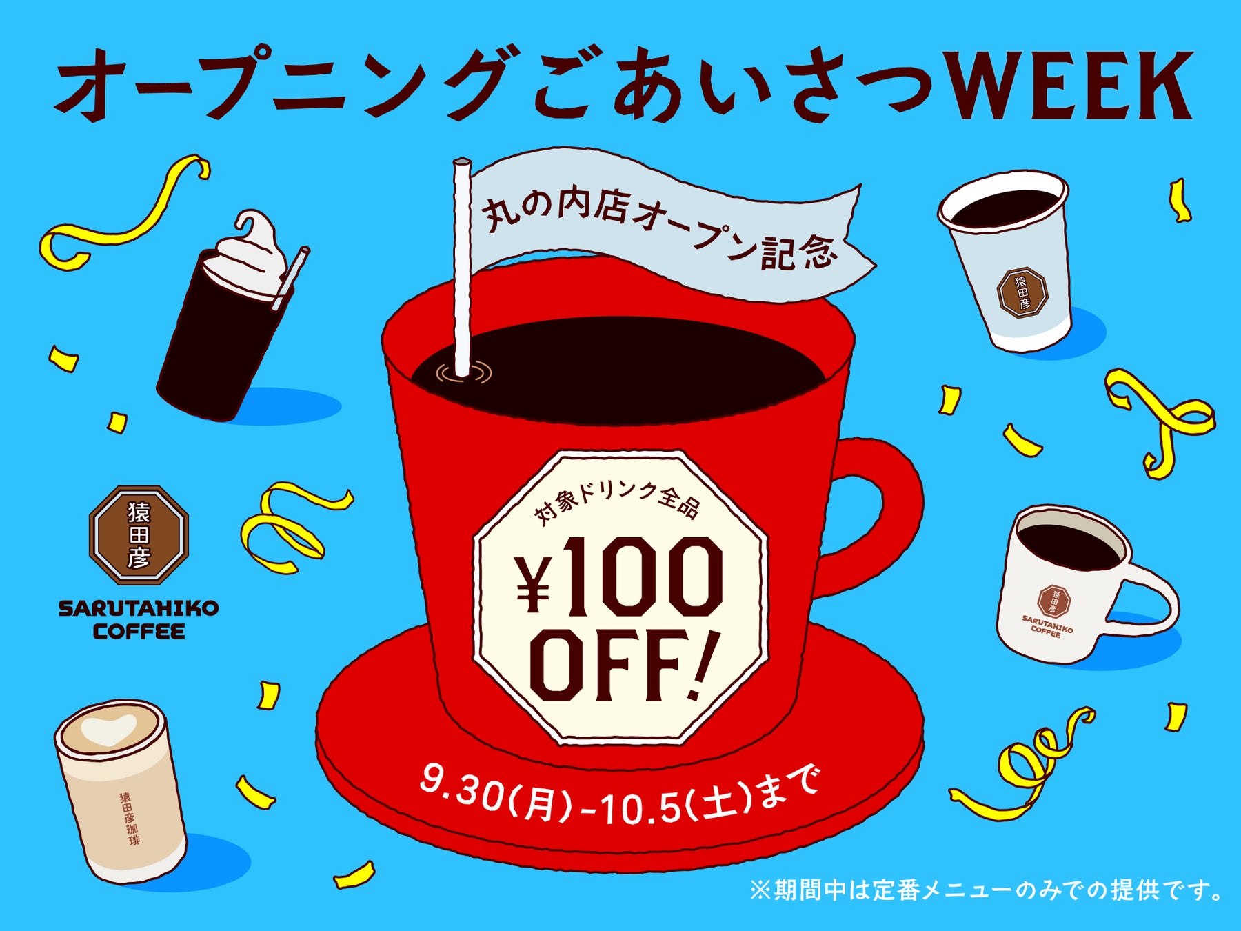 9月30日(月)〜10月5日(土)は対象ドリンクが全品100円引きの特別週間。数種類のコーヒー豆からお選びいただけるドリップコーヒーや、中浅煎りのブレンドを使用したフルーティーなカフェラテなど猿田彦珈琲の人気定番メニューで皆様をお迎えいたします。