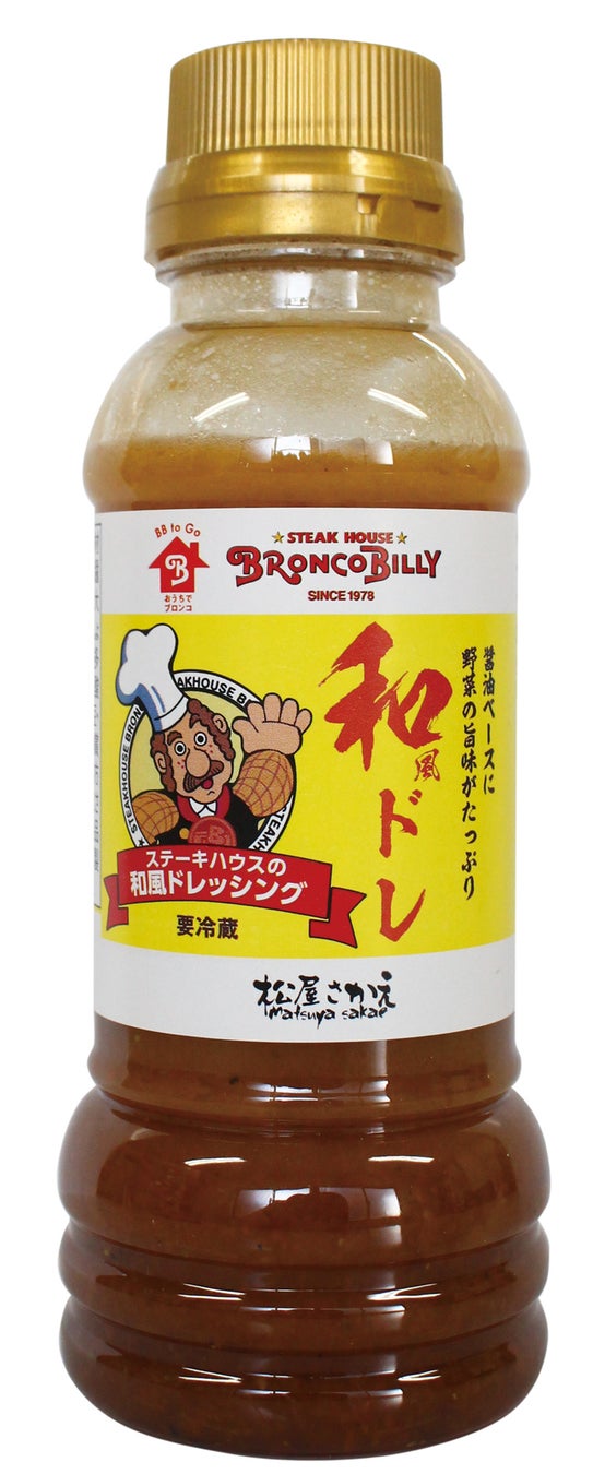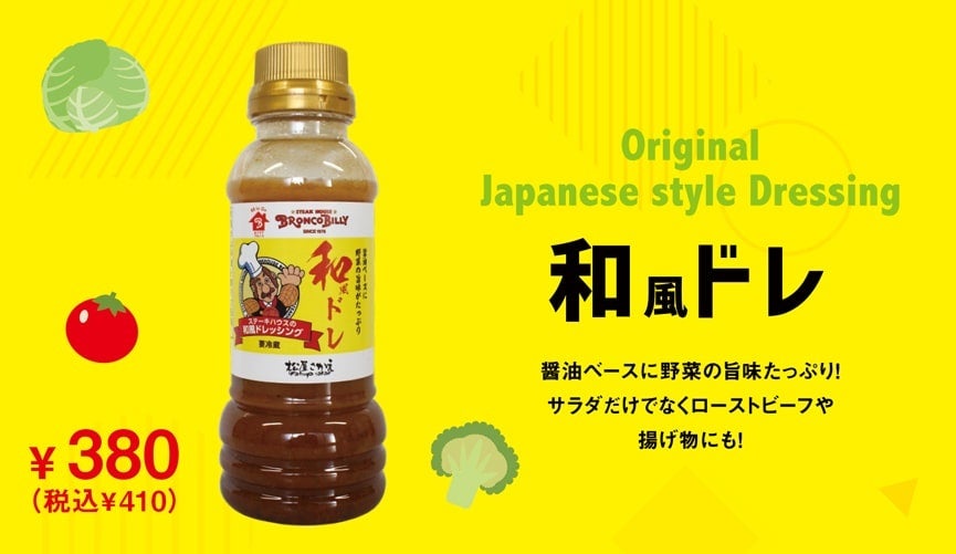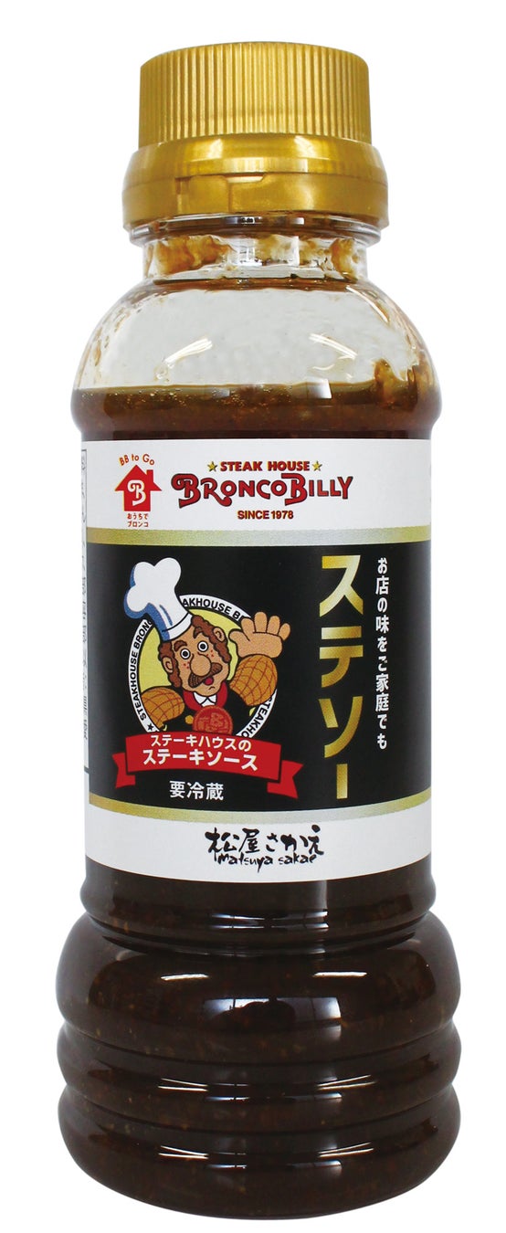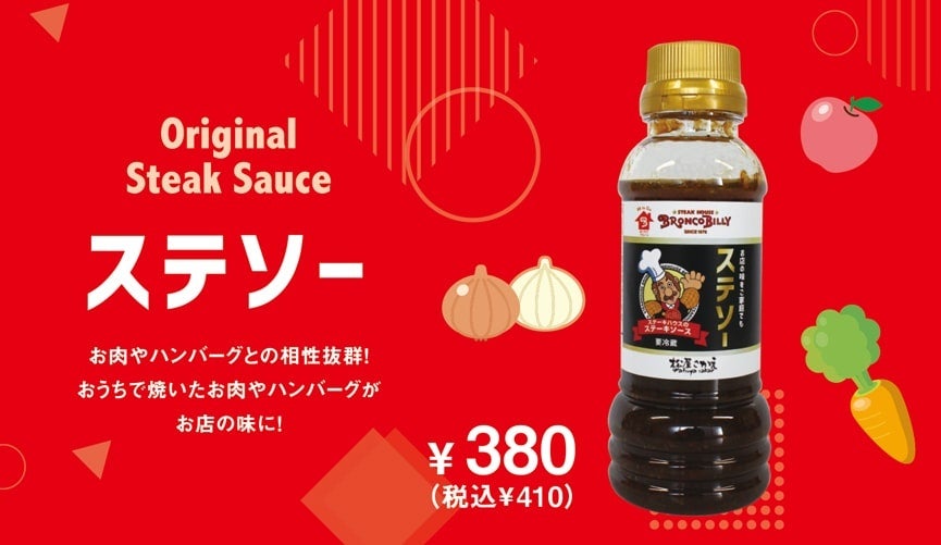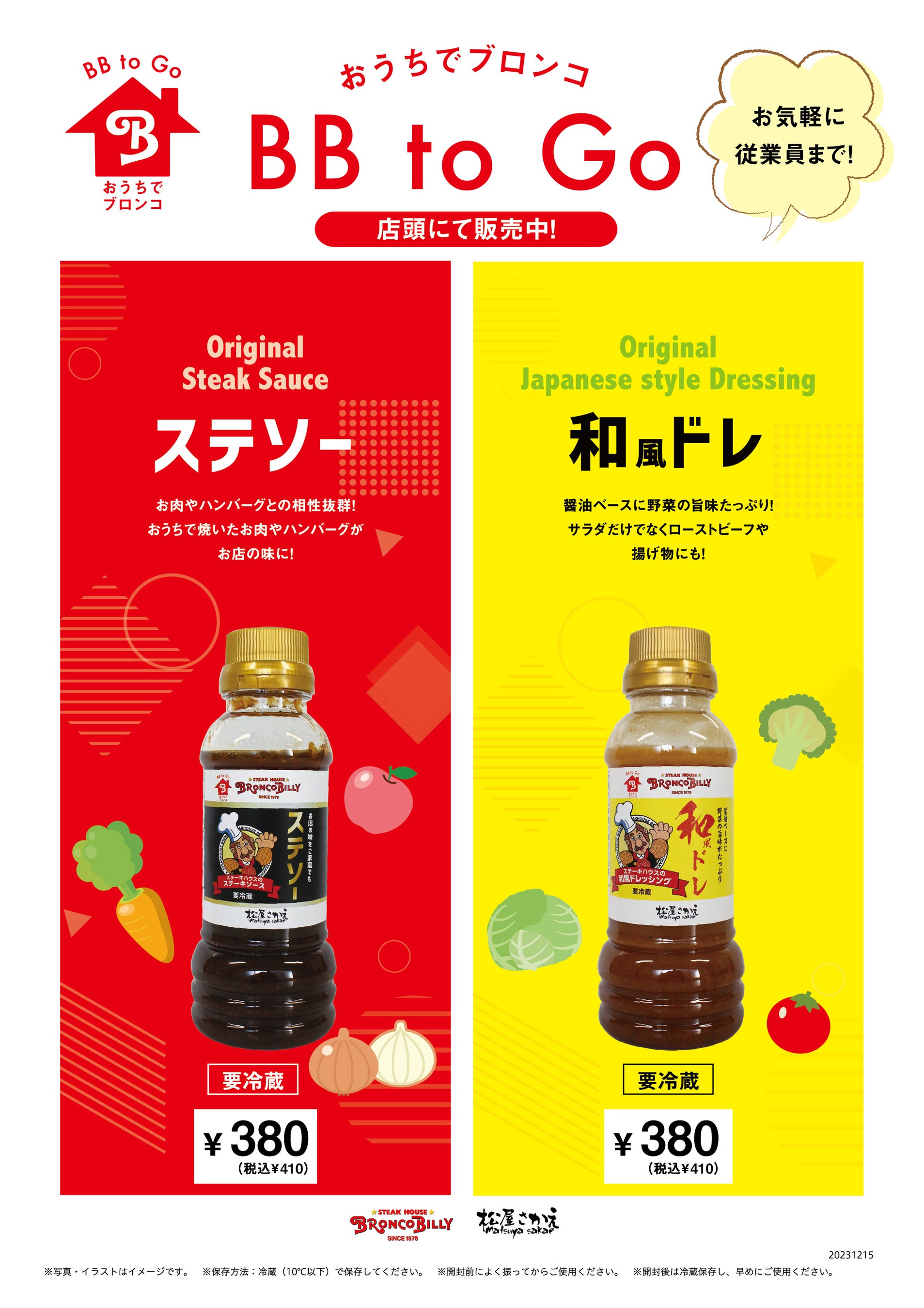 この度、その中から一番人気の和風ステーキソース『ステソー』と、和風ドレッシング『和風ドレ』を、ブロンコビリーの店頭にて発売いたします。お家でのお料理に、オフィスでのランチに、アウトドアでの料理やちょっとしたプレゼントに、様々なシーンでブロンコビリーの味をお楽しみください。