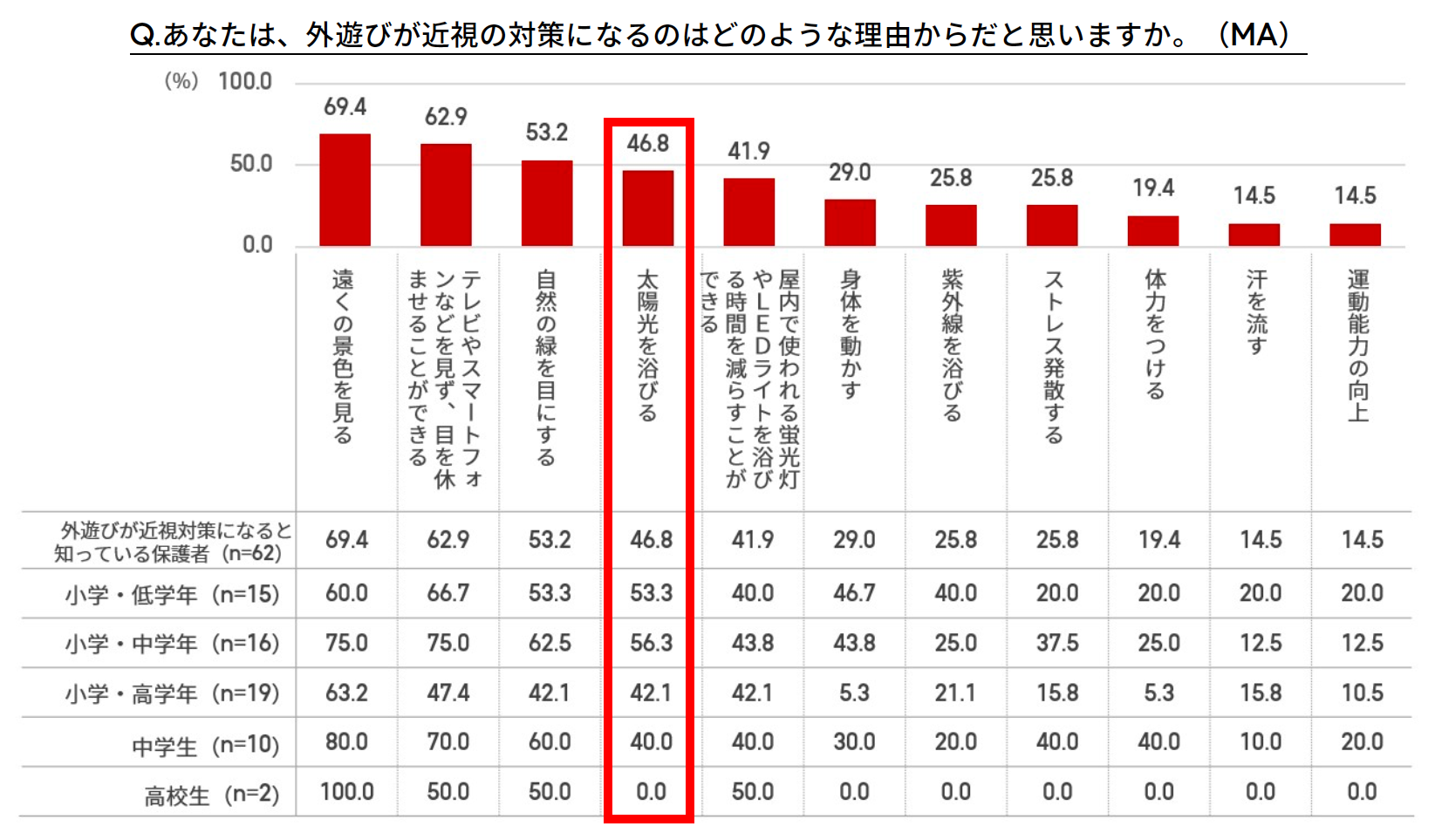そこで、バイオレットライトを含む「太陽光を浴びる」のが近視対策になるということへの認知度を調べるため、外遊びが子どもの近視対策になることを「知っている」と答えた23.6%の保護者に対し、その理由として一般的に想起されそうな選択肢を複数提示し選んでもらいました。結果は「太陽光を浴びる」を選択した保護者は46.8%と半数以下でした。外遊びが近視対策に有効だと分かっているわずかな保護者の中でも、太陽光を浴びることで近視進行が抑制されることを認知しているのはさらに少ないことが分かりました。