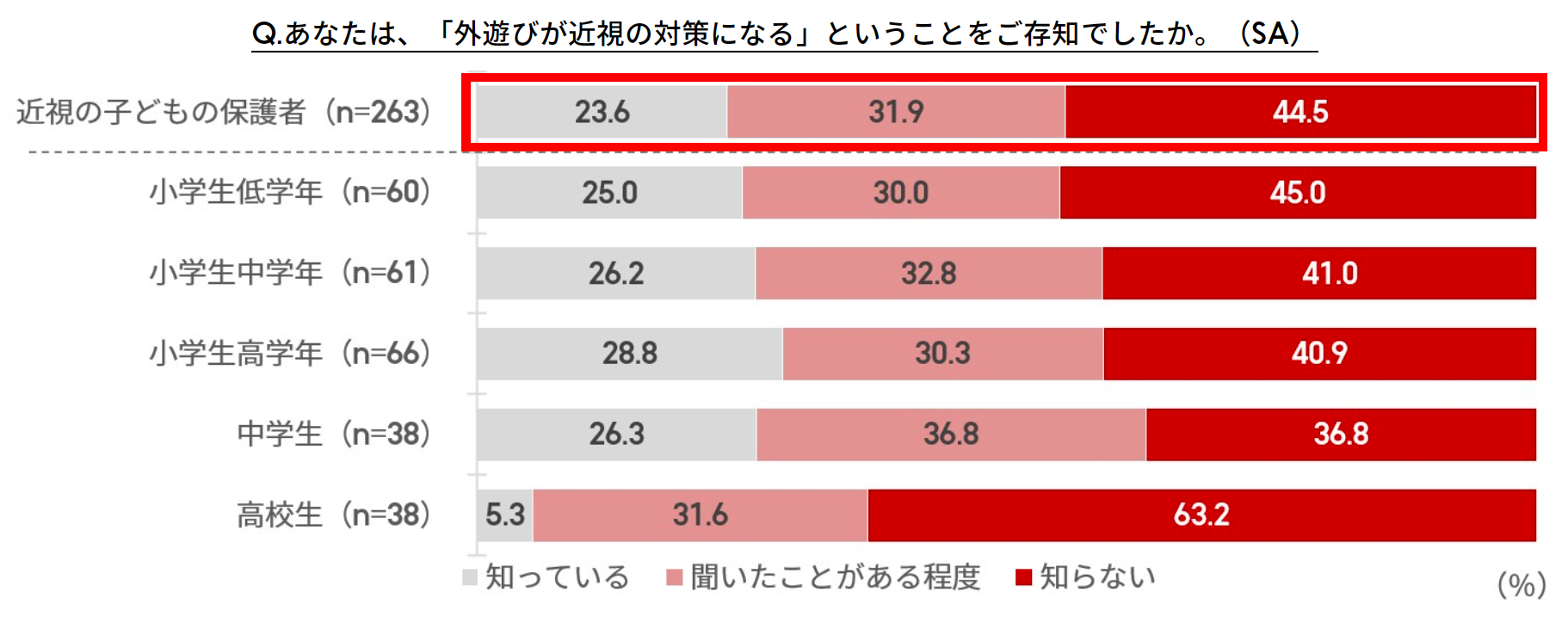 そこで、「外遊びが近視の対策になる」ということについて、近視の子どもを持つ保護者の認知・理解度を調べたところ、「知らない」という回答が44.5%と最も多く、「聞いたことがある程度」の31.9%と合わせると、保護者4人のうち3人(76.4%)は、外遊びが近視対策になることを十分に認知していないことが分かりました。