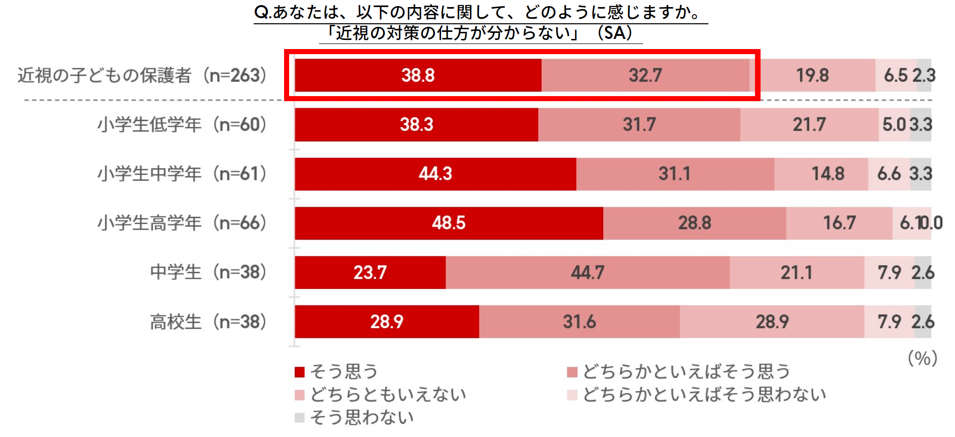 「近視の対策の仕方が分からない」という内容に対して、近視の子どもを持つ保護者の意識を聞いたところ、「そう思う」「どちらかといえばそう思う」という回答が合わせて71.5%となり、7割以上の保護者が近視の対策方法が分からないことが明らかになりました。
