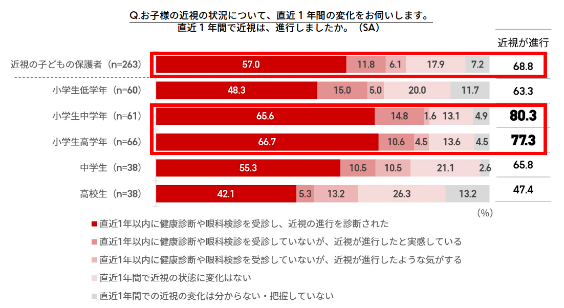 直近1年間での子どもの近視の状況について聞いたところ、「健康診断や眼科検診を受診し、近視の進行を診断された」が57.0%と最も多く、「健康診断や眼科検診を受診していないが、近視が進行したと実感している」の11.8%と合わせると、約7割の保護者が子どもの近視進行を認識または実感していることがわかりました。また子どもの学年別に見ると、小学生中学年が80.3%、小学生高学年が77.3%と、小学生の中~高学年が他の学年に比べて割合が高い結果となりました。