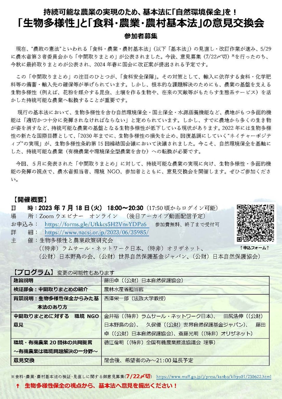 今回、5月に発表された「中間取りまとめ」に対して、持続可能な農業の実現に向け、生物多様性・多面的機能の発揮の観点から基本法を解説し、各NGOの発表を行います。また、希望される方と、農水省担当者、環境NGO、参加者とともに、意見交換会を開催します。ぜひご参加ください!