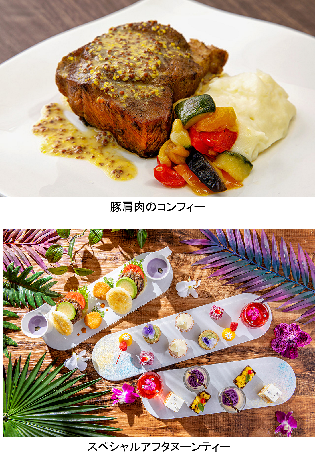 ランチとディナーの2プランあり、ランチプランではハワイのロコガールをイメージしたキュートなスイーツが豊富な「スペシャルアフタヌーンティー」を、ディナープランではポキやロミロミサーモン、ロコモコなどハワイのロコフードをお酒とともに楽しめる「ハイティー&バータイム」を、2022年6月にリニューアルオープンしたばかりのヒルトン東京お台場の「テラスラウンジ」を含むテラス席でお楽しみいただけます。