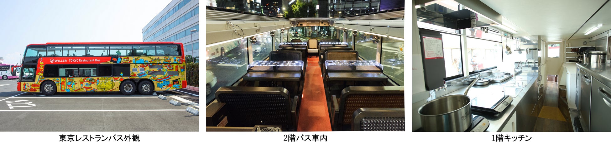 移動と食の融合により新たな感動体験を提供する「レストランバス」は、1階にキッチン、2階には対面式の座席とテーブルを備え、透明で開閉可能なオープンルーフは開放感があり、いつもと違う目線から眺める景色と、本格的な料理をお楽しみいただけます。東京レストランバスの外装は、東京らしさをイメージし、多数のビル群や観光名所を“食”と掛け合わせてポップなカラーリングでデザインしています。内装は、シックな色合いでまとめ、夜は調光可能なLEDと間接照明により、高級感あふれる落ち着いた空間になっています。