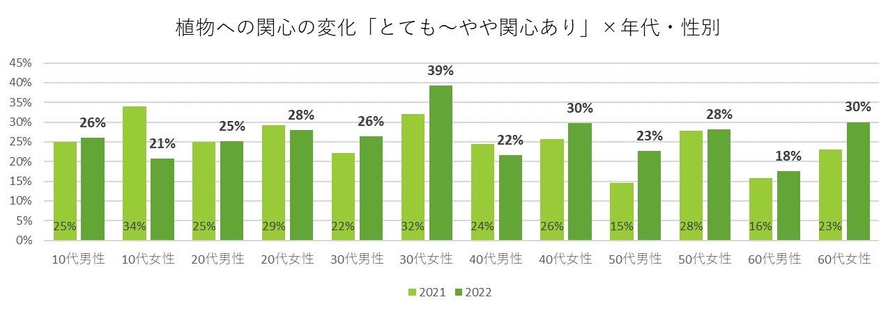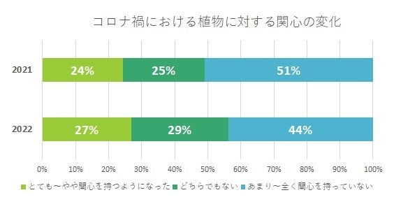 - 4人に1人がコロナ禍で植物に対して関心を持つようになったと回答し、50代男性は昨年比で約1割増加。