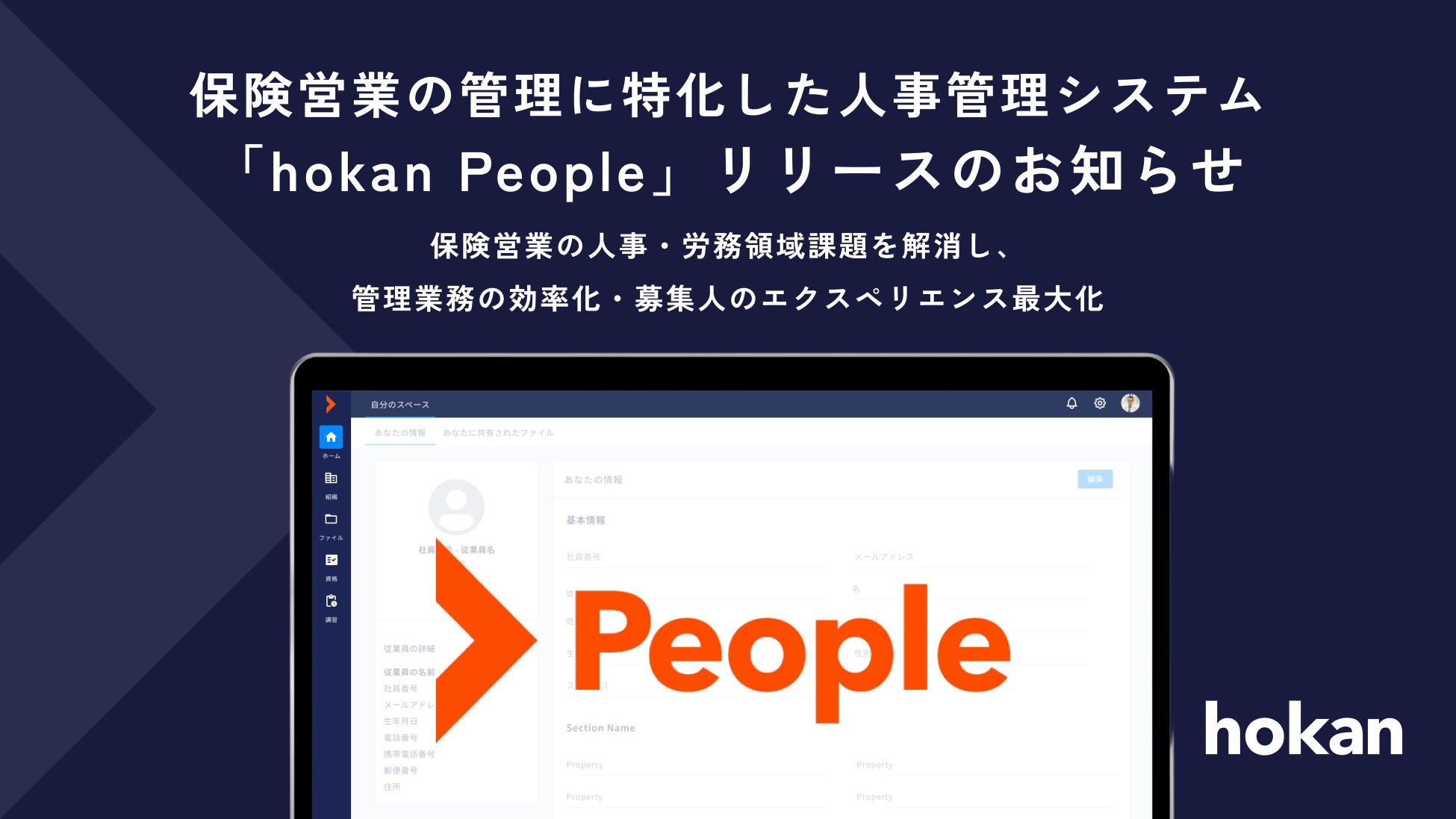 「適正な営業活動」と「組織の強固な監査体制」を実現するクラウド型保険代理店システム「hokan®︎」を提供する株式会社hokan(ホカン、本社:東京都中央区、代表取締役:小坂直之、以下:当社)は、保険営業の管理に特化した人事管理システム「hokan People」をリリースしたことをお知らせいたします。