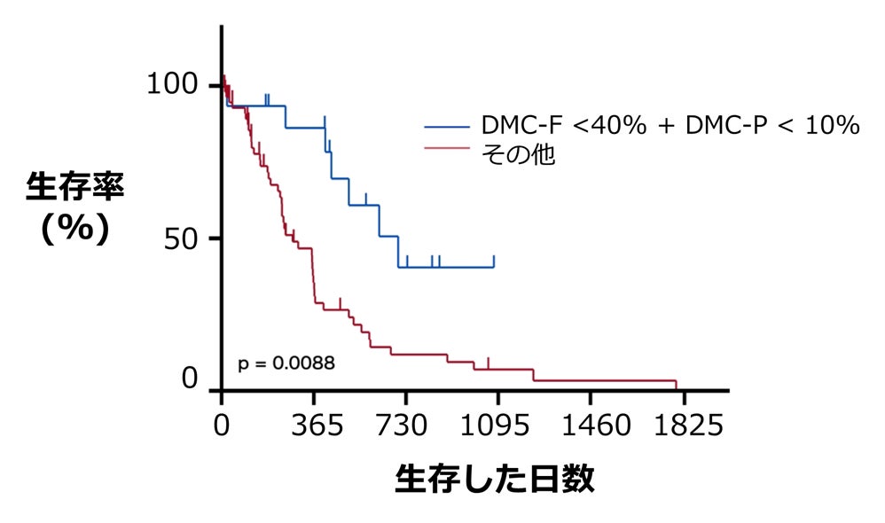 候補となった2つの DMCに対して、パイロシーケンス法を用いたイヌ100頭の検証を行った結果、メチル化レベルDMC-F<40%かつDMC-P<10%のグループは、予後が良好であることが示されました (下図、MST=697日vs299日、p=0.0088)。本研究から、MHGLに対するCHOP療法の予後予測は、これら2つの部位のメチル化レベルの解析によって可能となることが示されました。
