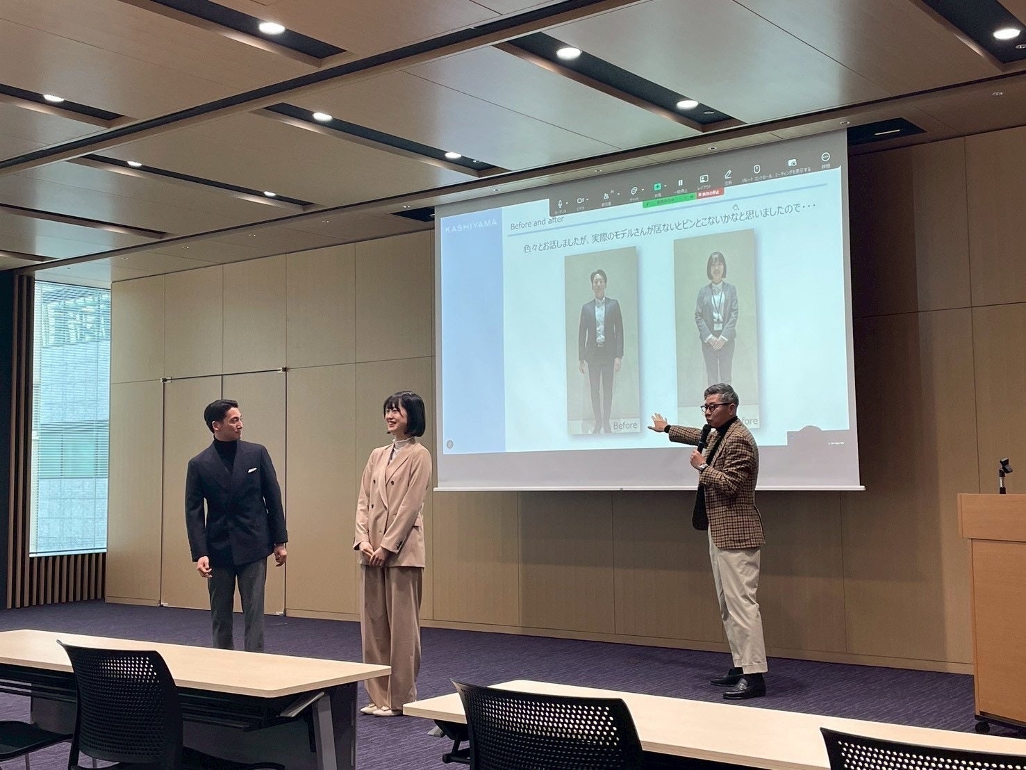 1週間前に『KASHIYAMA』の店舗で採寸・スタイリングを行い、ビジネスカジュアルの美しい着こなしへとアップデートした男女2名の職員が登場し、講師の茂木がその変化のポイントを分かりやすく解説。新たに仕立てたイタリアンスタイルのオーダースーツを着用した男性職員と、同様に洗練された装いの女性職員が、これまでのセミナー内容を実演を通じて総括しながら、服装によって見た目や印象が大きく変わることを披露しました。