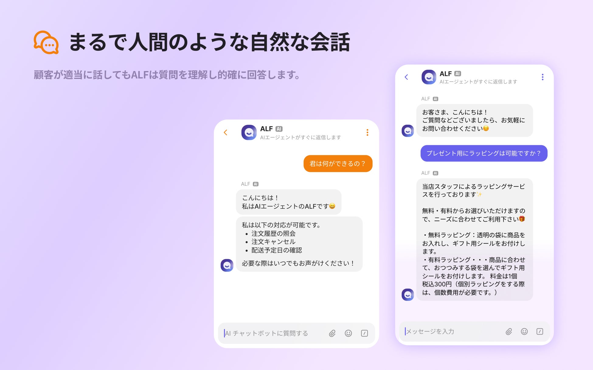 「ALF」は、ブランドごとに表現の仕方を変更することが可能です。そのためブランドイメージを損なうことがなく自然な問い合わせ対応を行います。