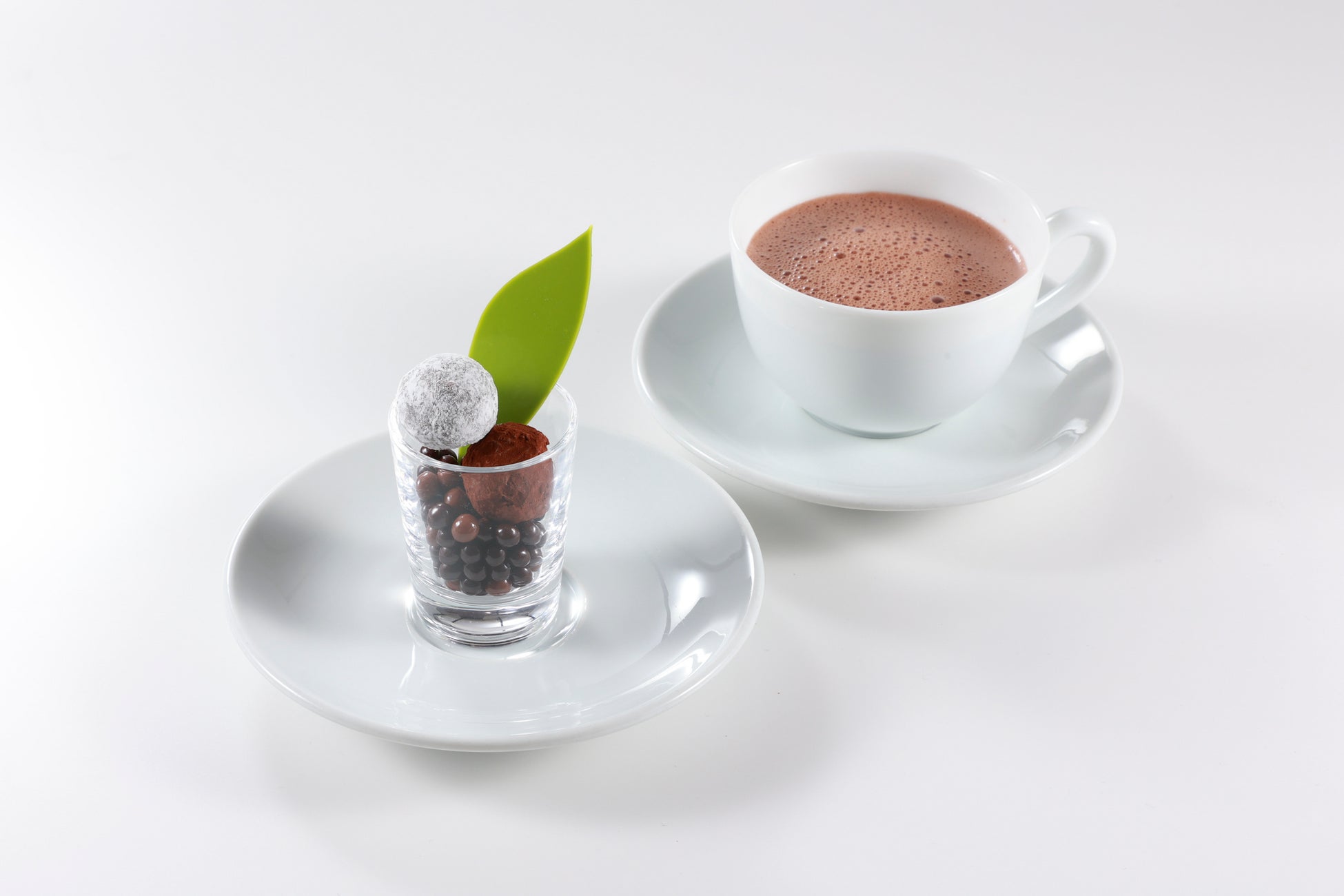 スズランをイメージしたショコラ(ビターチョコレートのトリュフ、フランボワーズ風味のトリュフ、ペルル クラッカントゥ)とお好みのドリンクのメニュー。