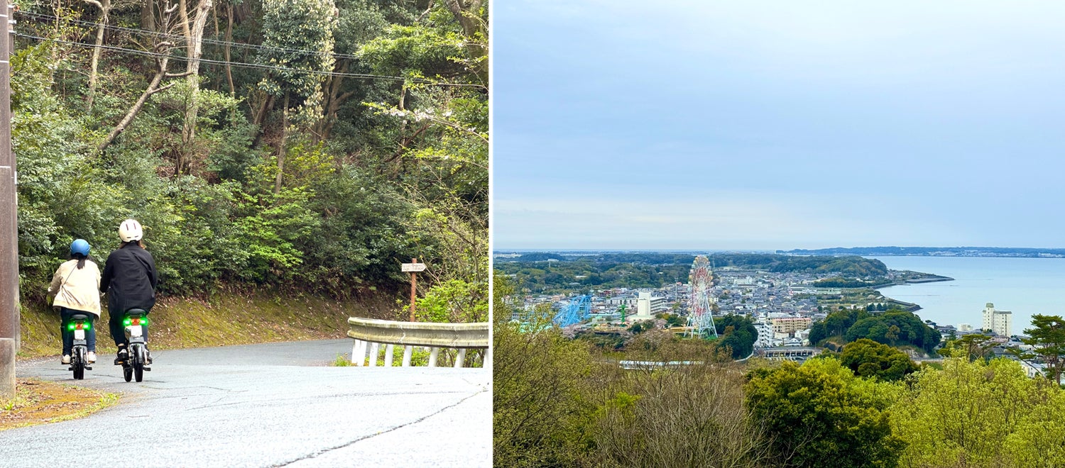 フラワーパークから少し足を伸ばして湖畔をぐるりと回り、温泉街の対岸にある標高113mの大草山に向かいます。山頂一帯には「浜名湖オルゴールミュージアム」や展望台などの施設がありますが、専用の駐車場がなく、また途中の山道はカーブが多く路上駐車が困難なため、多くの観光客はロープウェイを使用して上ります。しかし、こんなアップダウンのある道でもスイスイ進めるのが「NFR-01 Pro⁺」。急坂や狭い山道も漕がずに体力の負担を抑えながら走行でき、頂上近くから眼下に浜名湖周辺を一望できました。
