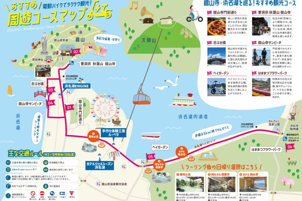 今回の導入に合わせ、周遊をよりお楽しみいただけるよう、舘山寺エリアの観光スポットや立ち寄りポイントを掲載した「周遊コースマップ」を作成し、貸出時に配布しています。