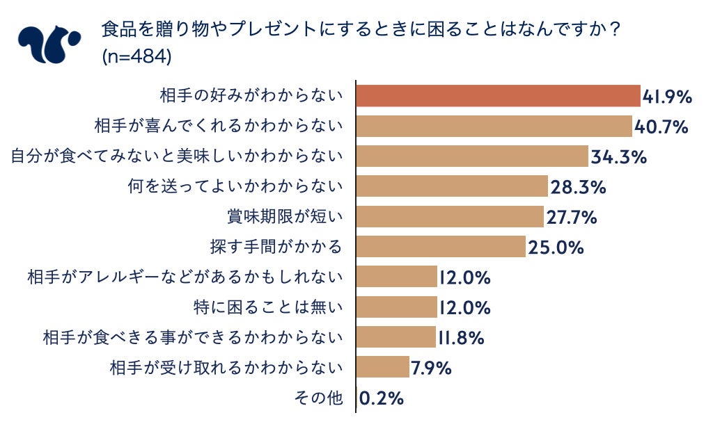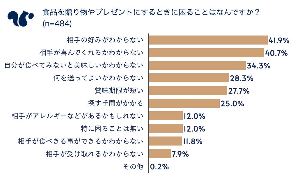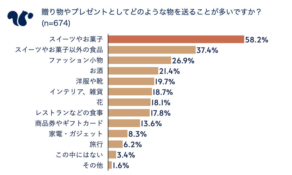 贈り物に関する調査を行い、贈り物としては「スイーツやお菓子」が最も使われているが、食品を贈る際に「相手の好みがわからない」ことが課題になっていることがわかりました。
