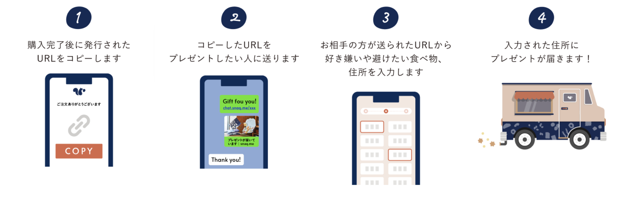 贈り手の方が販売サイトでご購入後に発行されるURLをLINEやメール、SNSなどで共有していただきます。受け取り手の方は、共有されたURLから好みの登録や住所登録をするだけでおやつのギフトBOXが届きます。