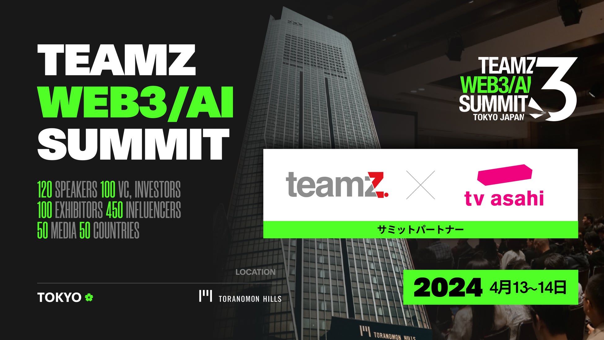 来年4月13 〜 14日・虎ノ門ヒルズフォーラム (東京都港区)にて開催を控える、TEAMZ主催 Web3/AI SUMMITでは、国内外から5,000人以上の来場を見込み、世界各国からWEB3とAIの分野で活躍する専門家たちが招かれます。日本企業のWeb3及びAI分野の事業展開を促進をビジョンとして、彼らの貴重な講演から日本市場と国際情勢の現状・業界理解を深めていく。
