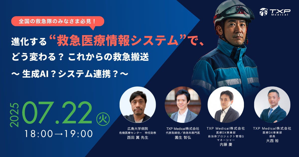 医療DX領域を担うTXP Medical株式会社(本社:東京都千代田区、代表取締役:園生智弘)は、2025年7月22日(火)18:00より、全国の救急隊・消防・自治体・医療機関向けにWebinar「進化する“救急医療情報システム”で、どう変わる?これからの救急搬送 〜 生成AI?システム連携?〜」を開催いたします。