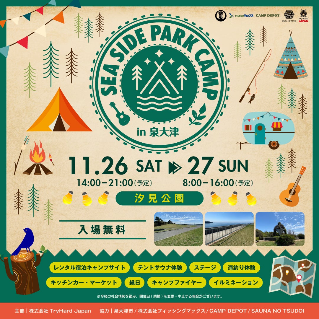 株式会社トライハードジャパン(所在地:大阪市中央区)は、2022年11月26日(土)27日(日)、汐見公園(所在地:大阪府泉大津市)にて、気軽にアウトドア体験が楽しめる複合型キャンプイベント「SEA SIDE PARK CAMP in 泉大津」を開催いたします。