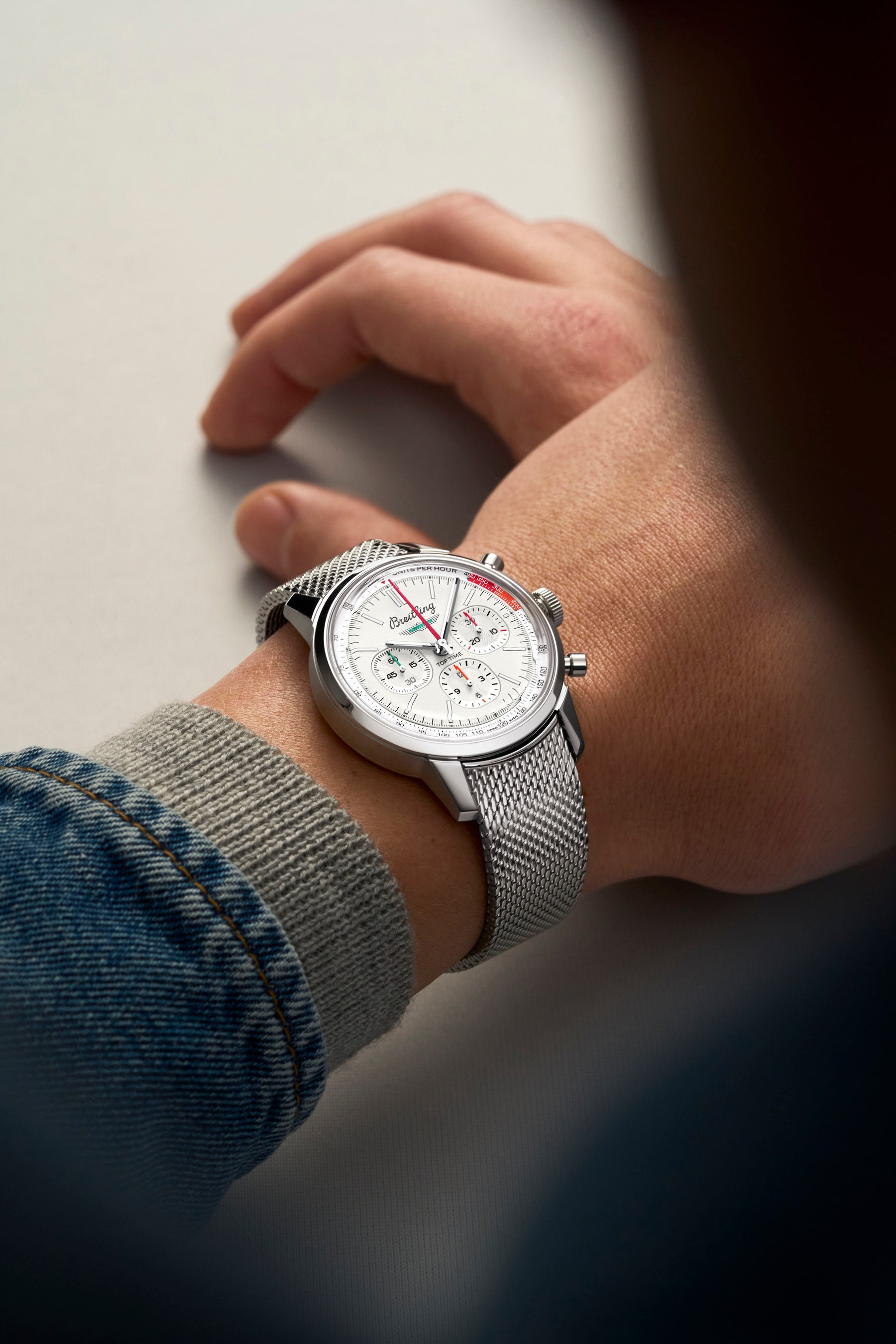 1960年代は実験、楽しさ、自由、そしてエネルギーに溢れた時代でした。オートバイを 駆り、スポーツカーを走らせ、全速力で人生を謳歌することが時代の命題でした。 創業家の3代目ウィリー・ブライトリングは、この時代の流れを感じ取り、その当時の活気をとらえた、伝統を打ち破るクロノグラフのデザインに乗り出しました。彼はそれを「トップタイム」と呼びました。トップタイムは当初から活動的であることを重要視しており、モーターファンやファッションセッターの間で瞬く間に人気となりました。男性からも女性からも好まれる最初のクロノグラフの一つで、その大胆なグラフィックデザインは、雑誌のページや銀幕を席捲(世界的な大人気スパイ、ジェームズ・ボンドでさえ、1965年の映画サンダーボール作戦で着用)していました。ブライトリングは、バイクではデウス・エクス・マキナやトライアンフモーターサイクル、クルマではフォード サンダーバードとマスタング、シボレー コルベット、シェルビー コブラ等ホイール界の最高にクールなブランドと提携し、トップタイムのデザインを作り上げており、そのスピリットと伝統は今も受け継がれています。