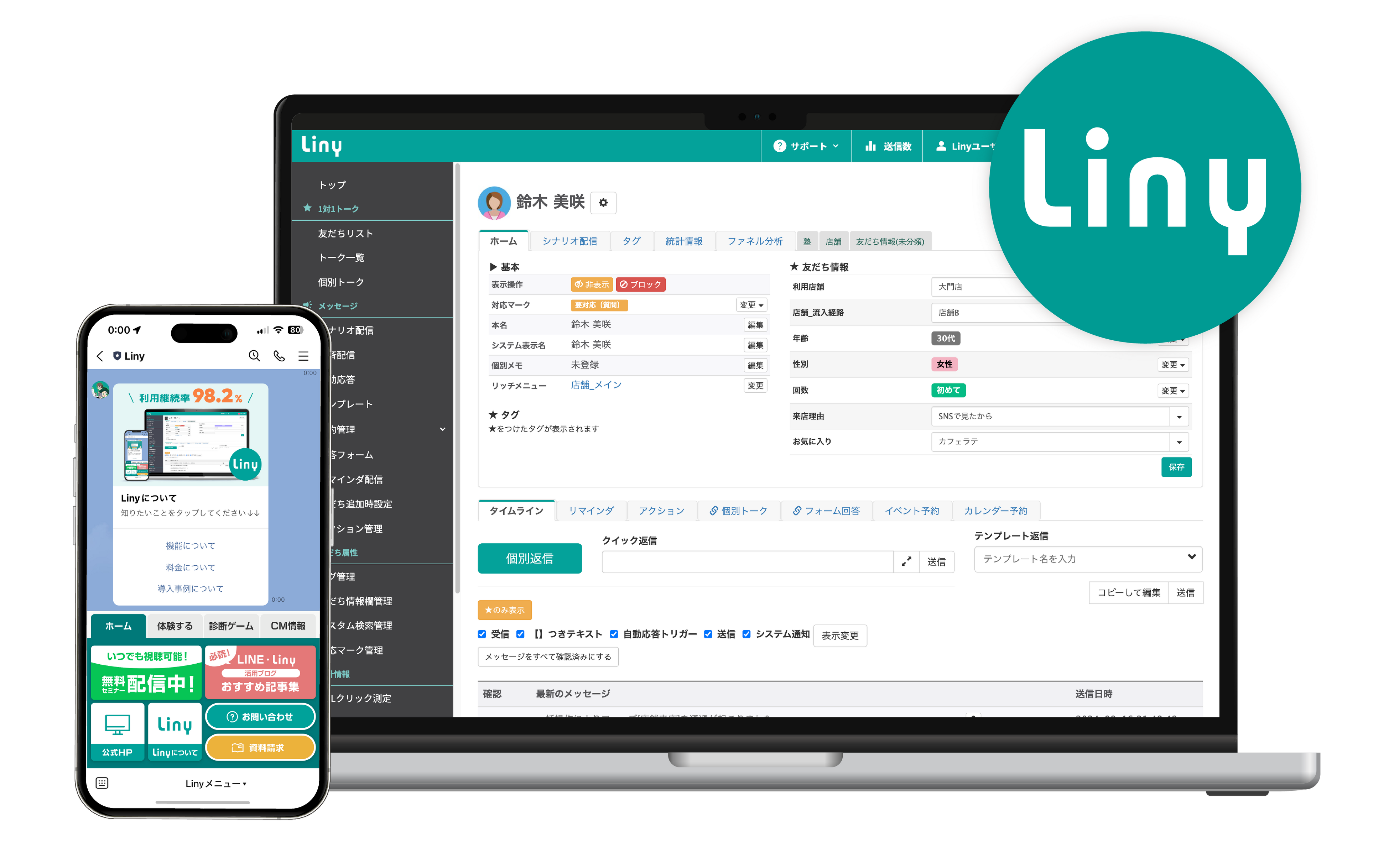 『Liny』はLINE公式アカウントの機能に加えてセグメント配信・顧客管理・自動応答・流入経路分析などの機能を備えた機能拡張ツールです。『Liny』を用いてユーザーの行動、属性、嗜好にあわせた1to1のマーケティングを実現することができます。都道府県自治体や省庁、教育機関や士業・金融・人材業界など幅広く導入実績がございます。