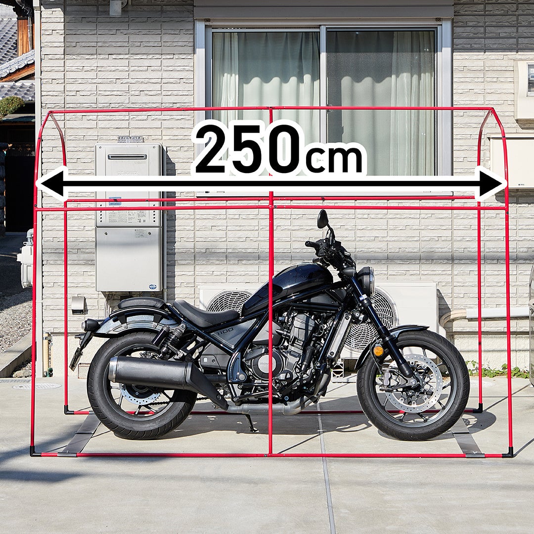当商品は、アメリカン(クルーザー)タイプのバイクに対応した奥行き250cmのロング設計と180cmの高い天井で、居住性に優れた簡易型のガレージです。