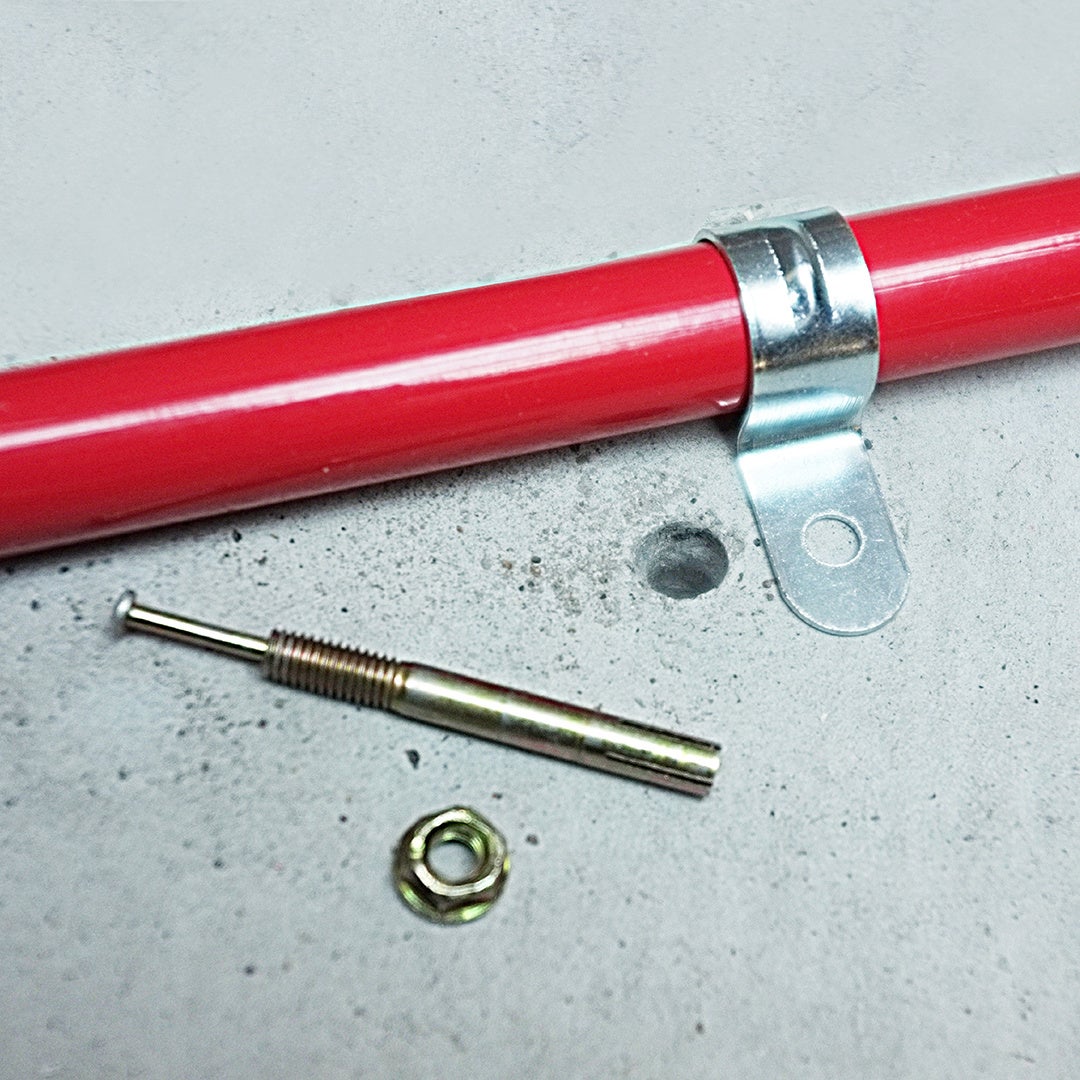設営には工具の準備が不要、番号のついたポールをつなぎ合わせ、カバーを被せて固定するだけです。地面に固定する際の大型ペグ、コンクリートに固定する際のクランプとアンカーボルトが付属しています。組み立てに自信のない方も安心の解説動画を用意しています。