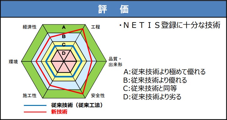 今回公表された評価結果では「従来技術より優れる」高評価を受けています。詳しくはNETIS公表資料をご覧ください。