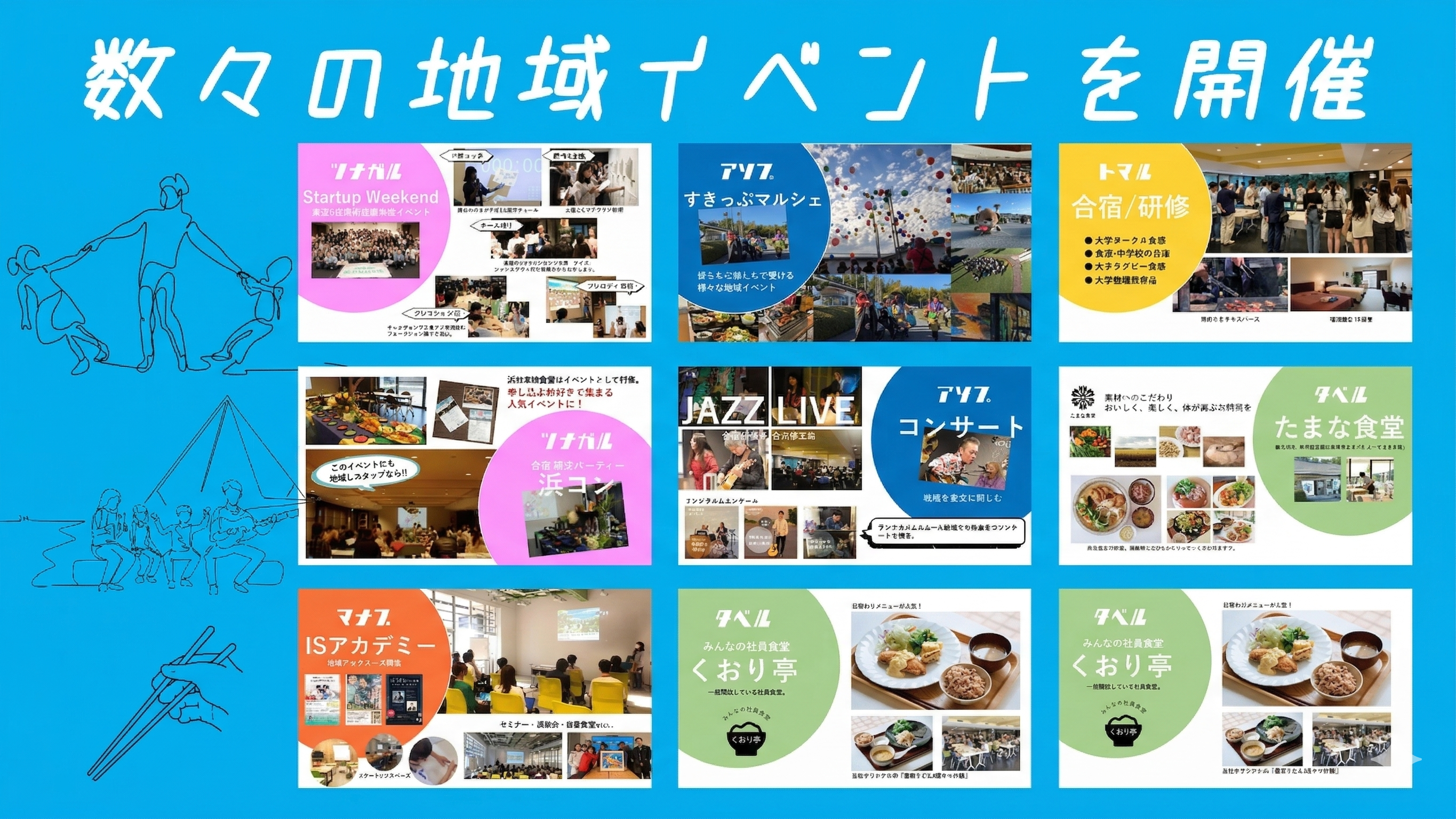 白浜本社では、一般の方でも利用可能な「みんなの社員食堂くおり亭」、地域活性化の為であれば夏祭りや婚活パティーのようなIT企業らしからぬイベントも自社で開催。