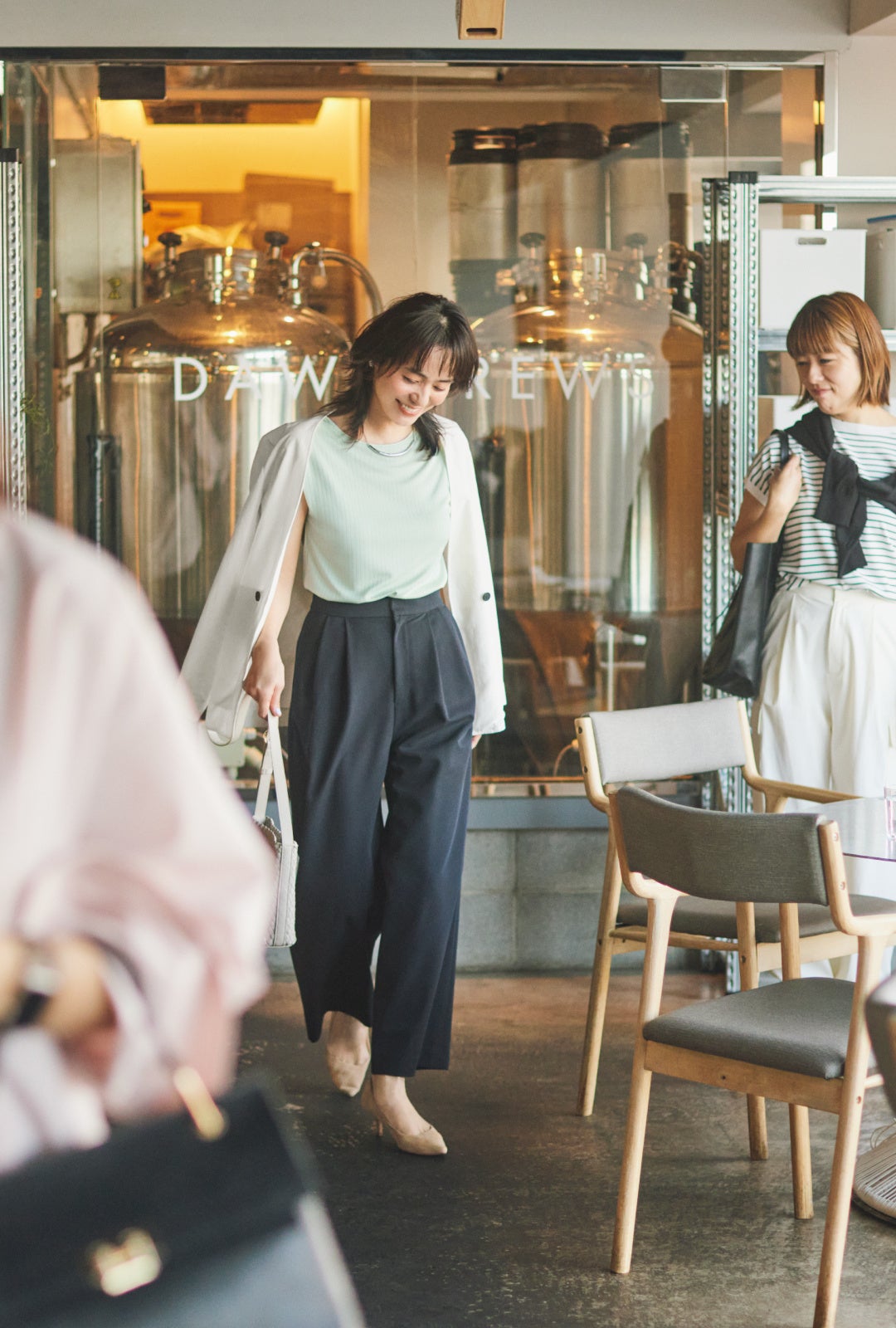 友人たちとのランチのシーン。ノースリーブも自信を持って着こなせるゴキゲンな日。