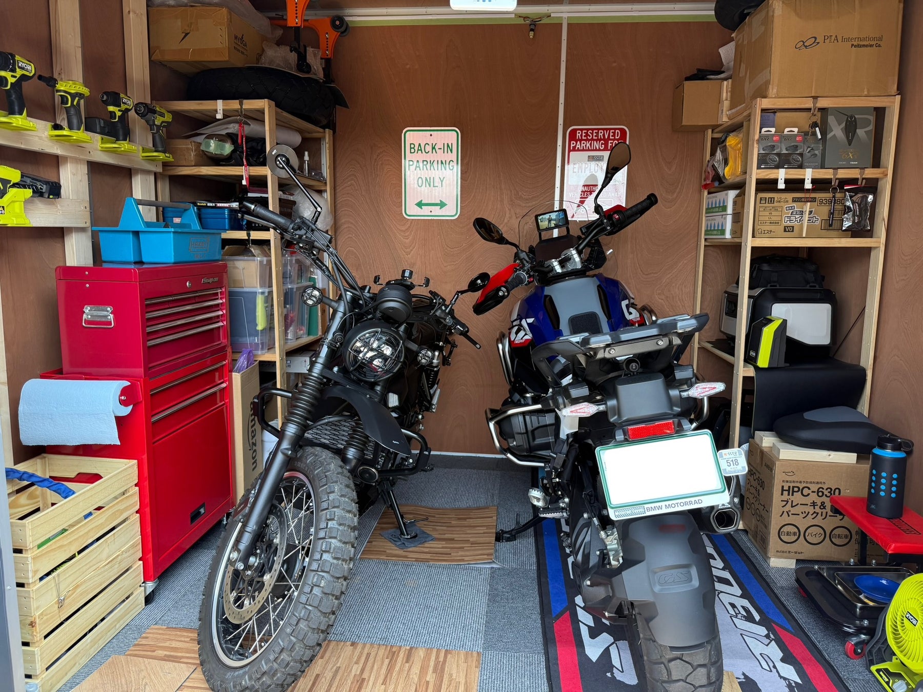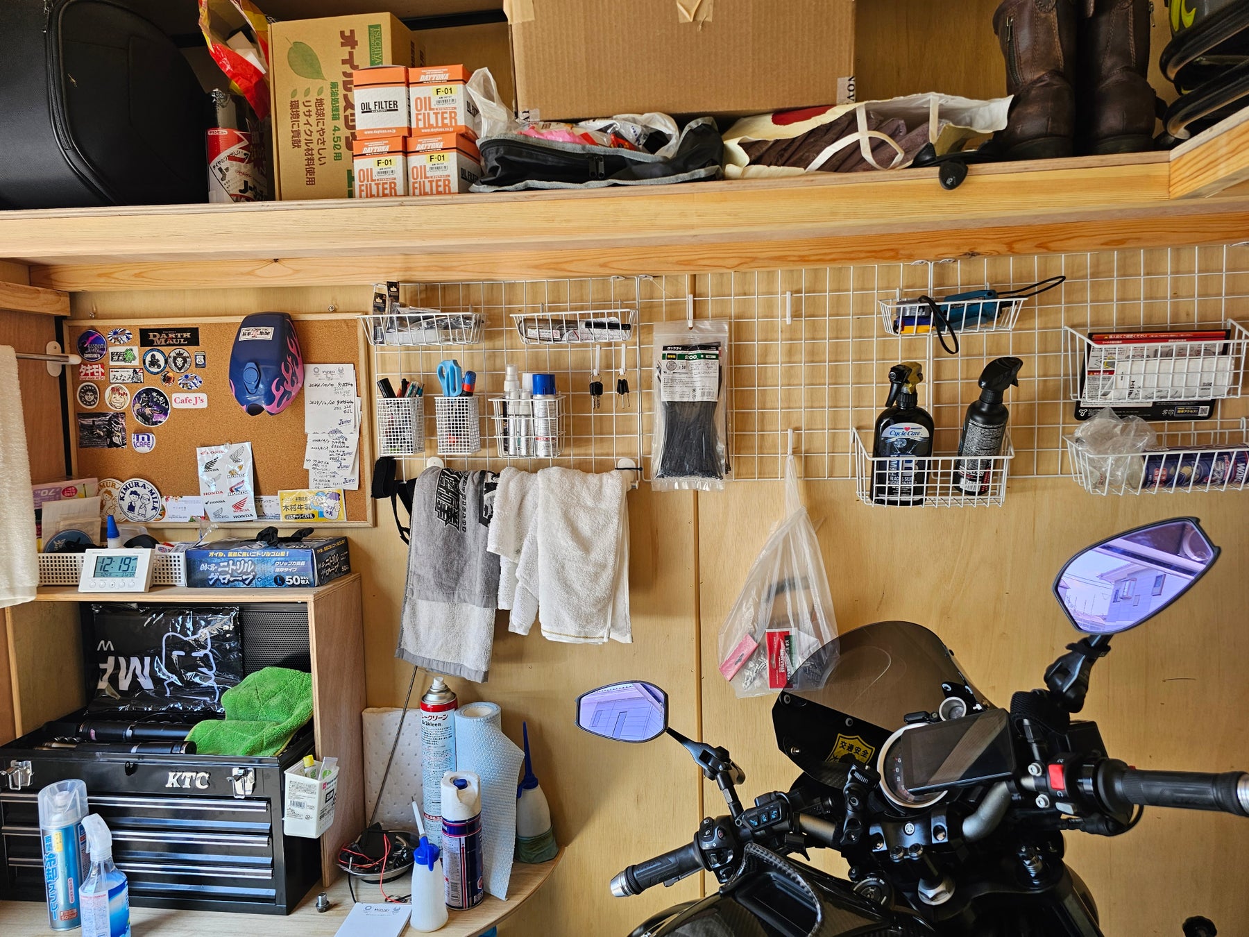 YK様:自作の壁掛け収納が素晴らしく、実用性・見せ方ともに優れている収納となっています。床も、カーペットと板を使い分けて敷いており、重たいバイクでも収納しやすく、そして中を汚さないような細かい工夫がうかがえます。