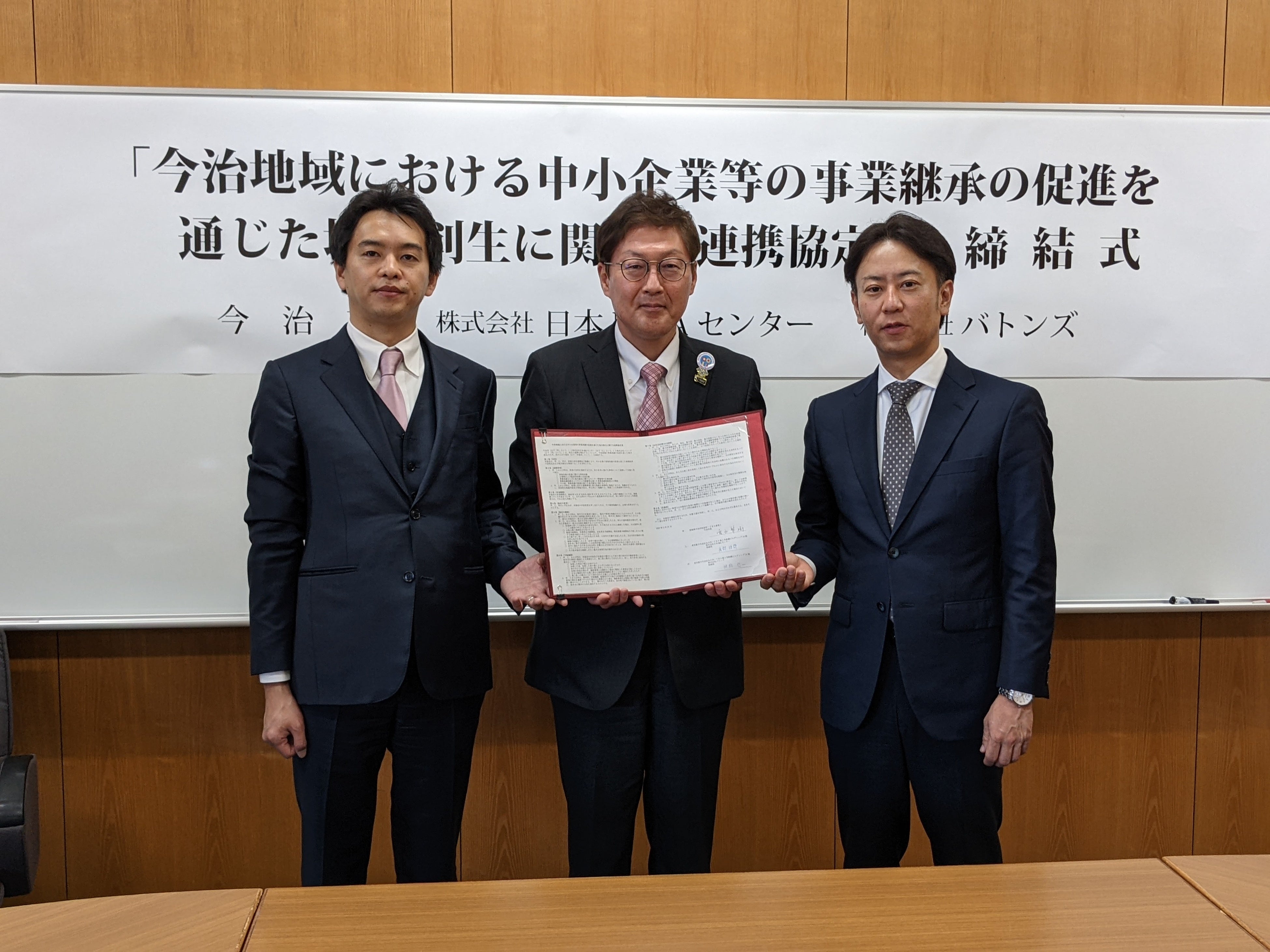 (左から)株式会社日本M&Aセンター 取締役 渡部 恒郎、今治市長 徳永 繁樹 様、株式会社バトンズ 取締役 CMO 神瀬 悠一